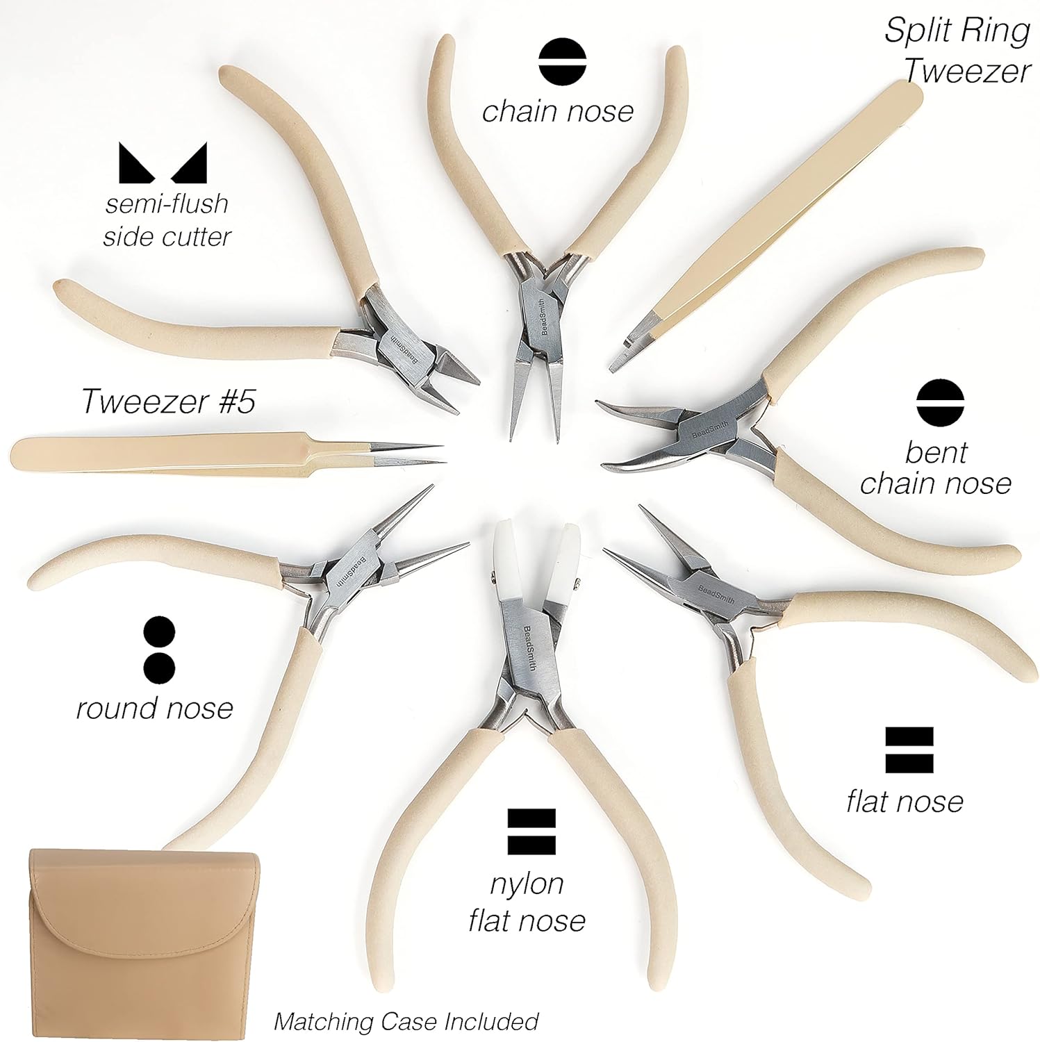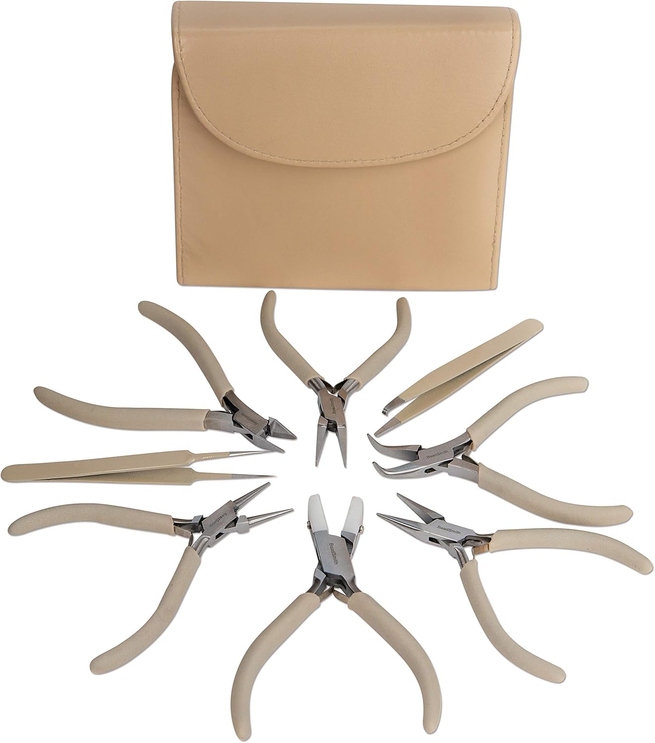 The Beadsmith Fashion Color Pliers – Set of 8 Slimline Color-Coordinated Tools – Matching Clutch in Beige – Jewelry Making Supply Kit to Create Necklaces, Bracelets, Earrings & More