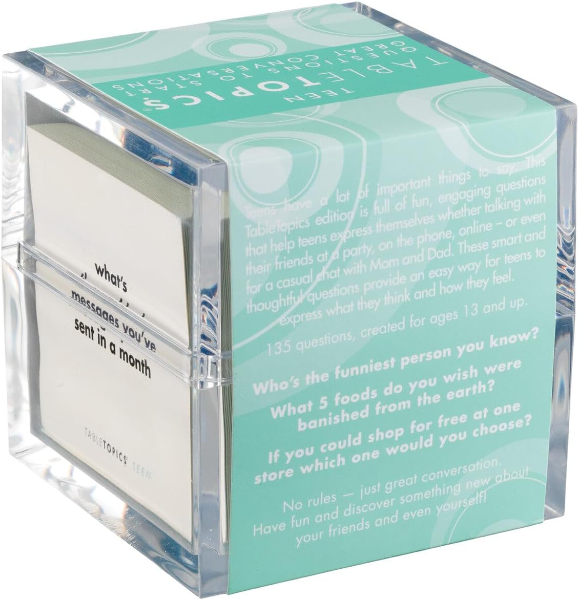 - What You Get: 135 sturdy cards with printed questions held in a stylish, clear cube container