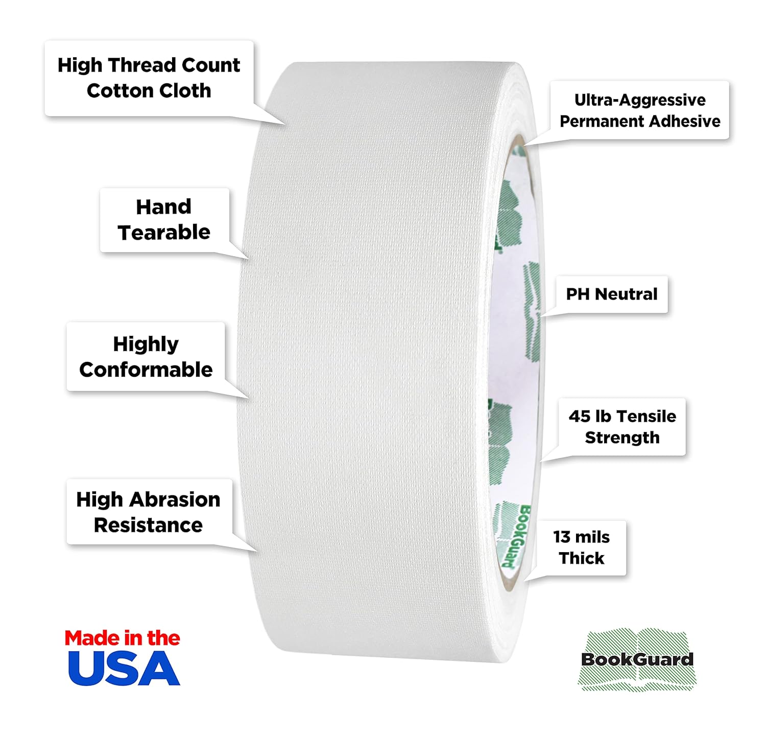 BookGuard 1-1/2 Inch Vinyl-Coated Cotton Cloth Bookbinding Repair Tape, 15 Yard Roll, White