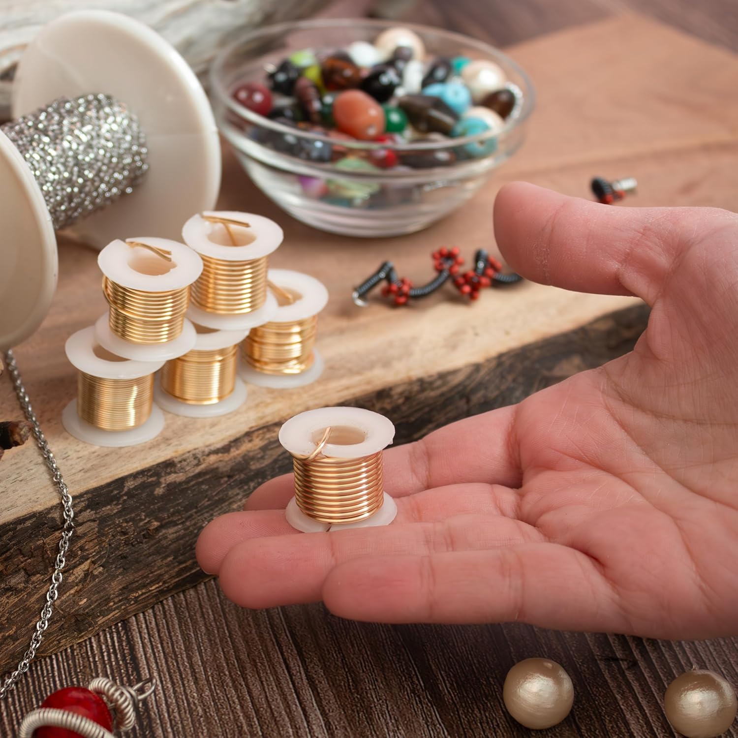 - INCLUDES: This assortment pack of medium temper wire contains six 0.75" (2 cm) mini spools, each containing varying lengths of craft wire (1-6 yards). You will receive two 16-gauge spools, one 18-gauge spool, one 20-gauge spool, one 22-gauge spool, and one 24-gauge spool, all in gold color.