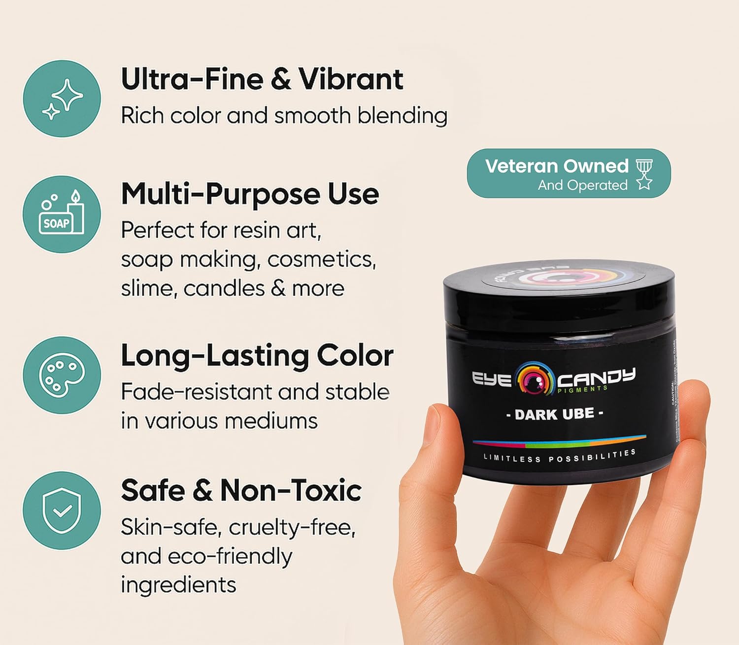 - MULTIPURPOSE PURPLE MICA POWDER – Step into the enchanting world of our Dark Ube, a deep and intense dark purple pigment that effortlessly captivates the eyes. Its rich hue and unmatched vibrancy offer a treasure trove of possibilities for your creative ventures. Whether you're diving into epoxy resin, acrylic painting, or crafting captivating slime, bath bombs, jewelry, melt & pour projects, plastics, or candles, our Dark Ube has got you covered.
