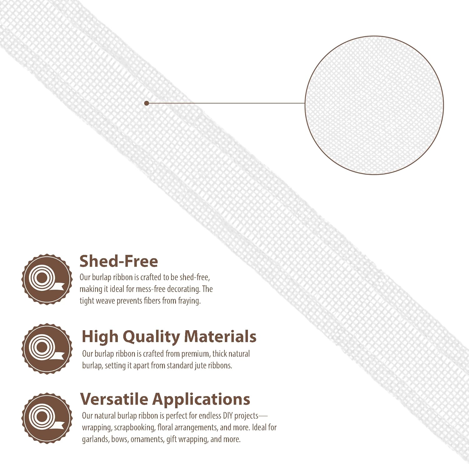 - Natural Burlap Ribbon: Compared to other jute burlap ribbons, our rustic burlaps ribbon with a fray & shed-resistant hemmed edges is made from thicker white burlap fabric. The indoor & outdoor colored burlap crafts ribbon is colorfast and will not bleed.