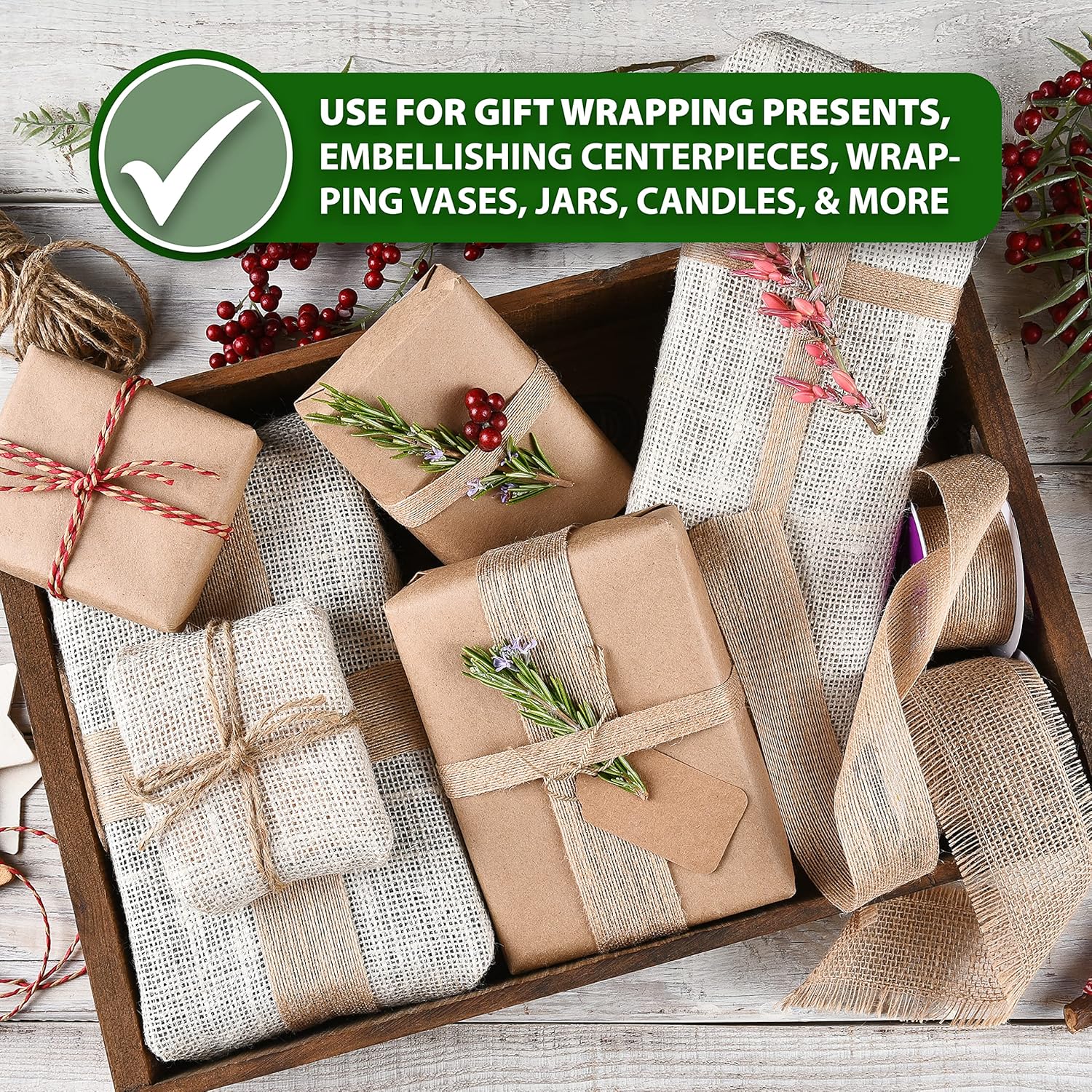 - Burlap White Ribbons for Wrapping, DIY, Scrapbooking, & Floral Arrangement: The rustic ribbon is the ideal-colored burlap fabric for garlands, bows, flower, cards ornaments & curtains tiebacks and gift wrapping ribbon for boxes & baskets.
