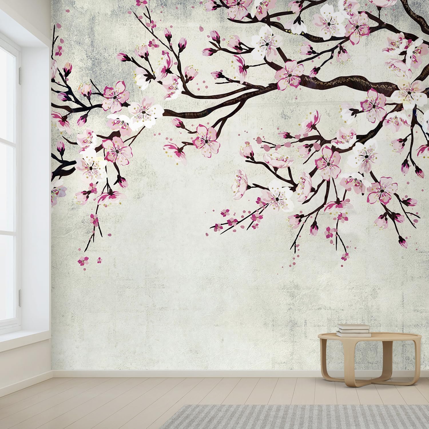 wall26 - Large Wall Mural - Watercolor Style Ink Painting Pink Cherry Blossom on Vintage Wall Background | Self-Adhesive Vinyl Wallpaper/Removable Modern Wall Decor - 66x96 inches