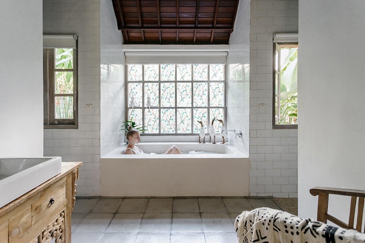 VSUDO Static Cling Decorative Window Privacy Film – Frosted Privacy Window Film with Jasmine Floral & Stained Glass Design, Adhesive-Free Tint for Home, Bathroom & Office (17.5" x 78.7")