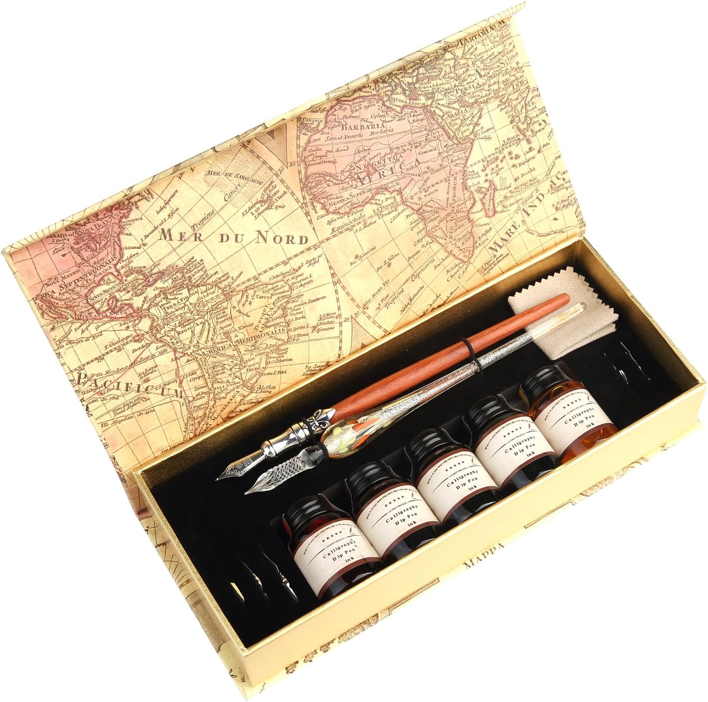 - Calligraphy Set: Include 1 wooden pen, 1 glass dip pen, 6 nibs, 5 colors dip ink.