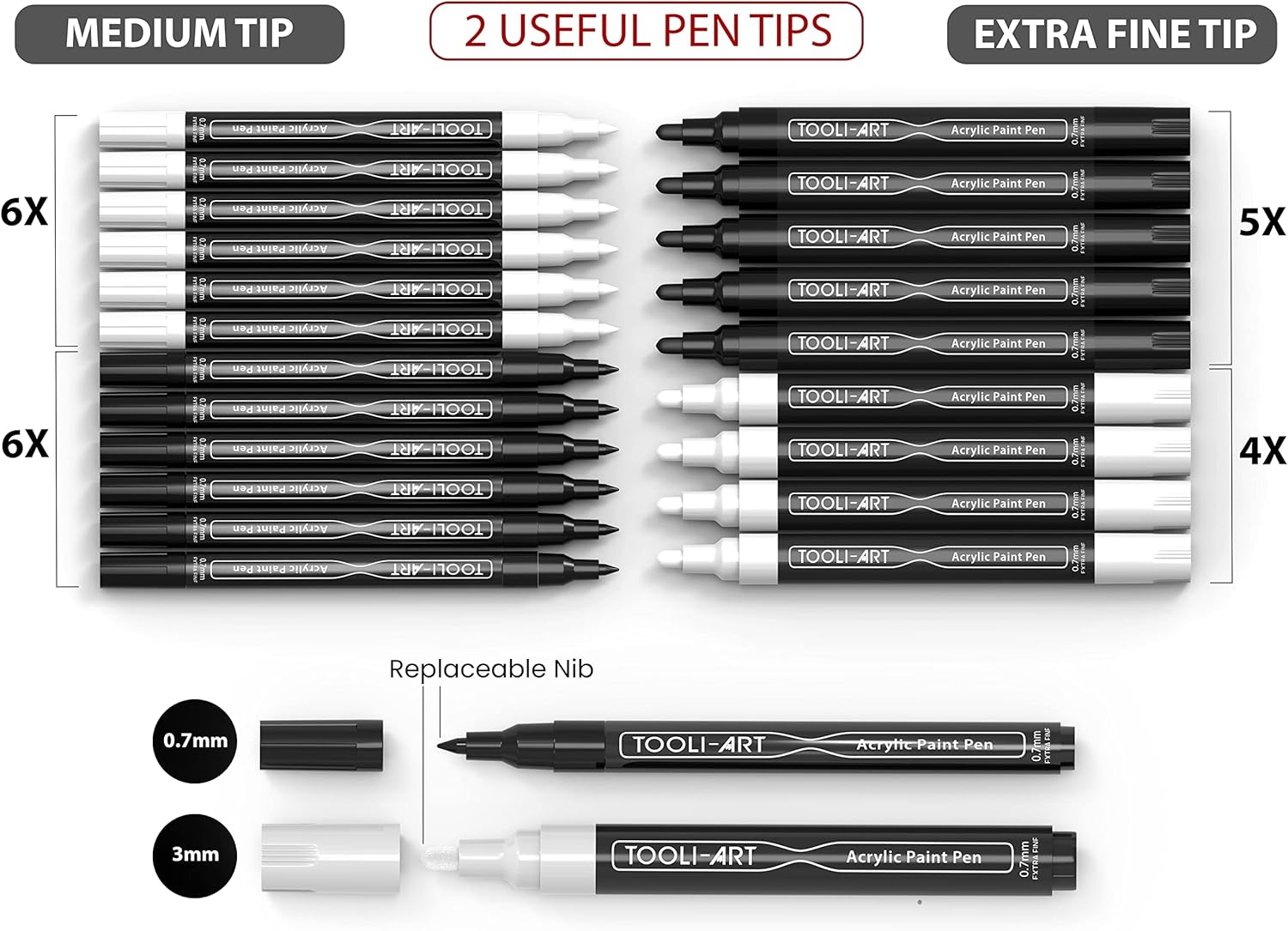 - ✔️AMAZING VALUE – In this 21 paint pen marker combo, you get 12 extra-fine tips (6 black & 6 white) and 9 medium tips (5 black & 4 white) for all your detail and touch up needs. This ensures that you won’t run out of the most commonly used pens for a long time.