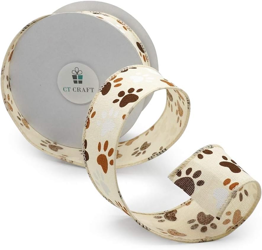 CT CRAFT LLC Ivory Canvas Dog Paw Wired Ribbon 1.5 Inch x 10 Yards for Christmas Home Decor Tree Topper Bow Gift Wrapping DIY Crafts Wreath Garland