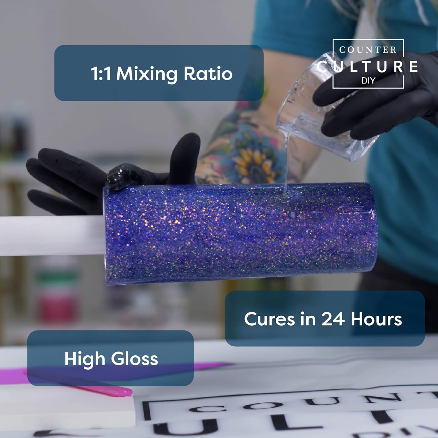 - INCLUDES: Counter Culture DIY 1 Gallon Kit Clear Artist Resin. The kit includes 2 Half Gallon Containers (Part A and Part B) to mix and create 1 Gallon of Artist Resin. This epoxy resin will produce a crystal-clear, glass-like finish.
