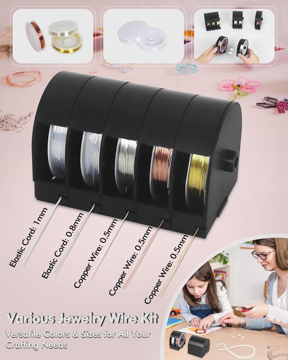 - Various Jewelry Wire Kit – Includes 5 rolls of craft wire: No fading copper coils (0.5mm, 24 gauge*3) and elastic cords (0.8mm*1; 1mm*1). Features the most popular colors—gold, copper, and silver—selected for their versatility and practicality, perfect for wrapping stones, beading, and creating necklaces, bracelets, earrings, and other jewelry projects.