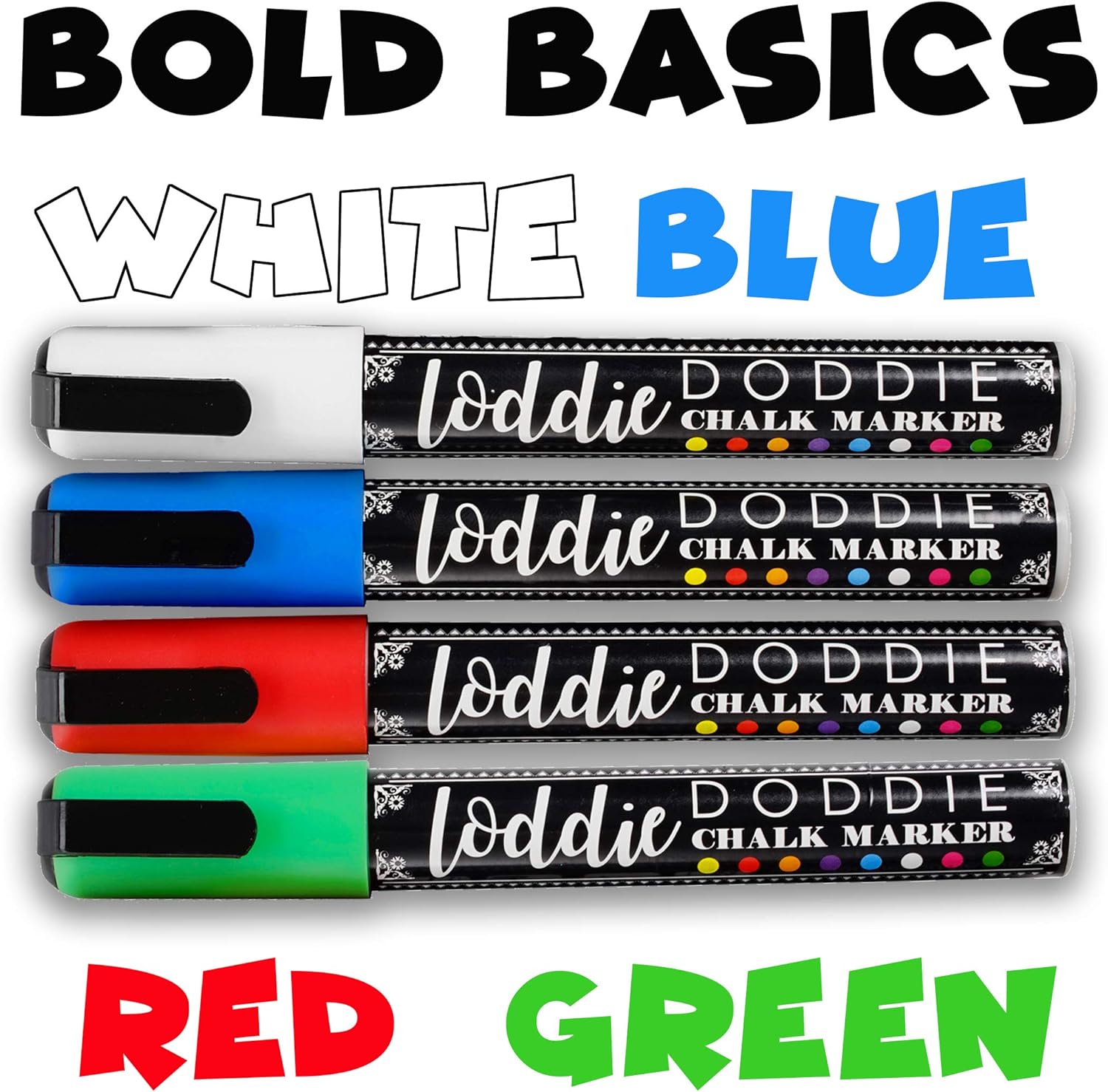 Loddie Doddie Liquid Chalk Marker Set - Pack of 4, Basic Colors, 6mm Tip - Fine-Tip Chalkboard Markers for Blackboard - Washable Window Pens for Glass - Dual Ends for Chalkboard Calendar