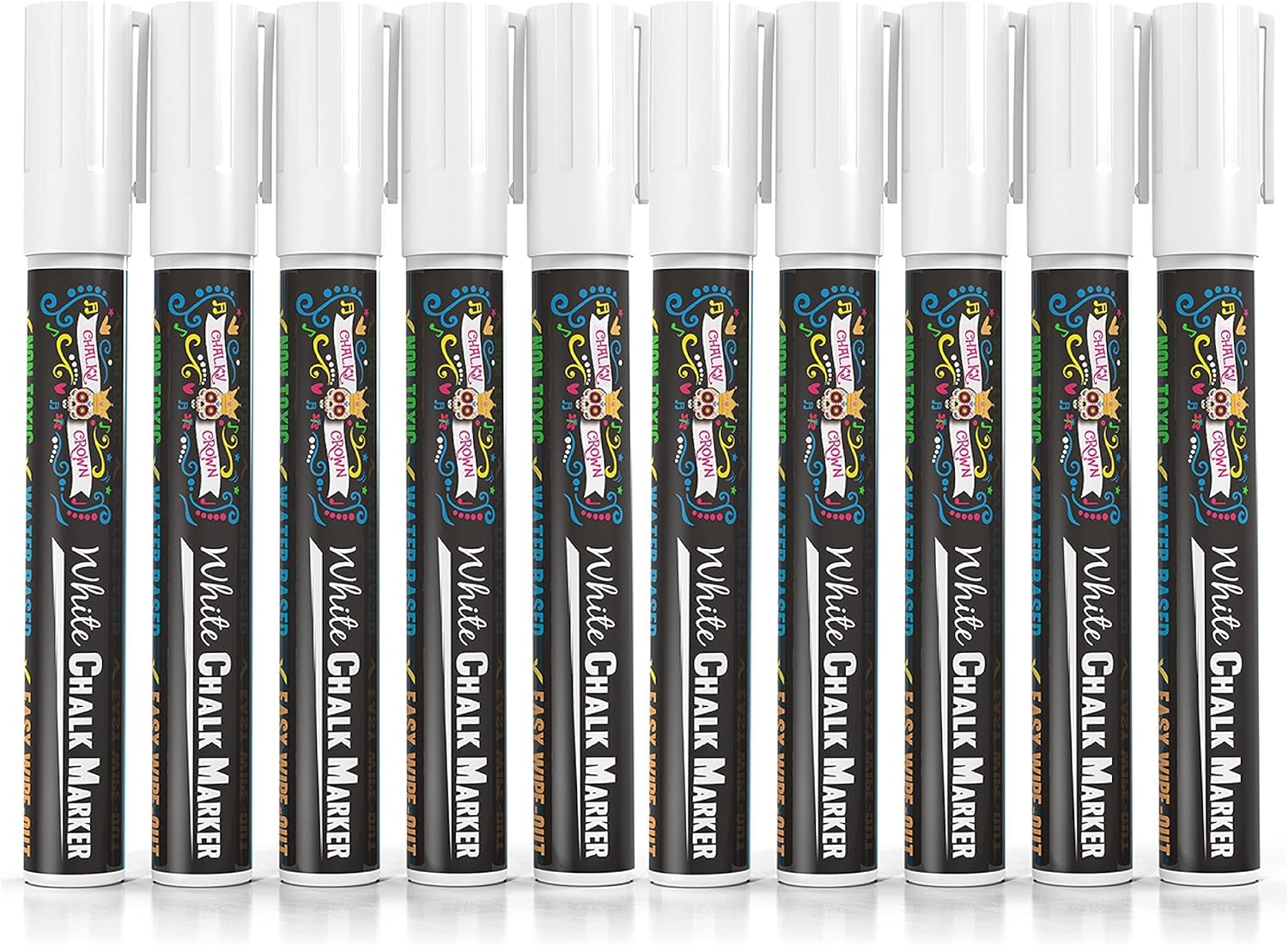 CHALKY CROWN Liquid Chalk Marker Pen - White Dry Erase Marker - Chalk Markers for Chalkboard Signs, Windows, Blackboard, Glass - 6mm Reversible Tip (10 Pack)