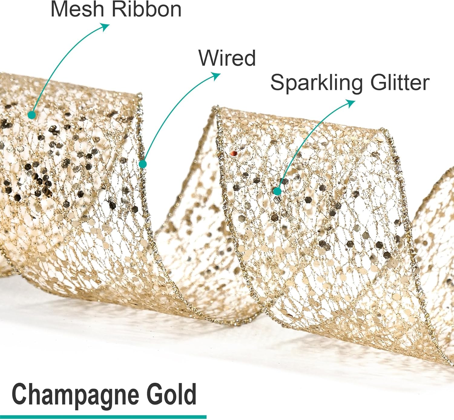 - GREAT WORKMANSHIP - Our Sparkling Glitter Mesh Wired Ribbon 2.5" has a density weave so you won’t find any loose edges. You won’t find any fraying ends or loose strings anywhere, making our Sparkling Glitter Mesh Wired Ribbon 2.5" Champagne Gold color perfect for high-end and professional DIY works and Crafts.