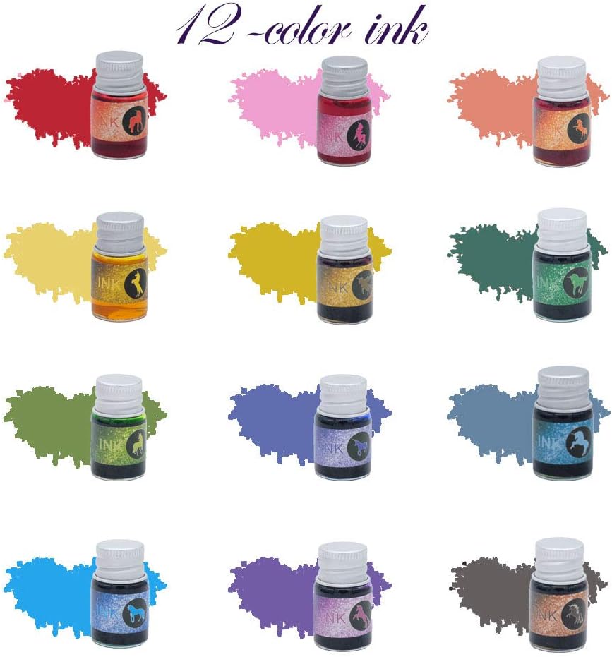 - ❤12 VIBRANT COLORS INK: 12x7ml colors of ink contain gold powder enable your creation more incredible. If you are looking for an ink which is shimmering, highly reflective colors that are lightfast, archival, and permanent, works for illustration, calligraphy pens, dip pens, drawing pen ,this calligraphy ink set would be your best choice. Shake the ink bottle well before use.