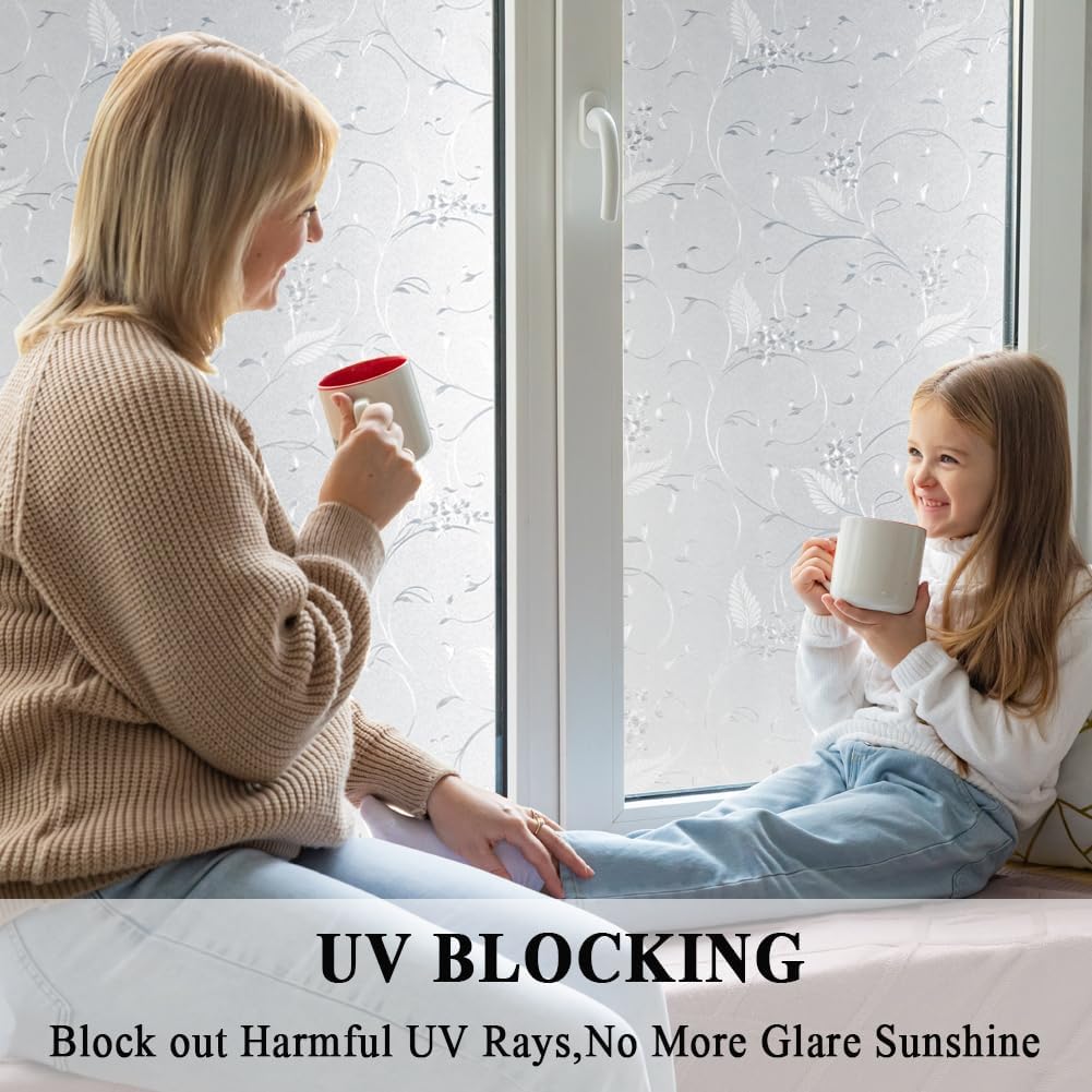 Mikomer Privacy Window Film Etched Flowers Static Cling Glass Door Film, Non Adhesive Heat Control Anti UV Window Cling for Office and Home Decoration,17.5 inches by 118 inches