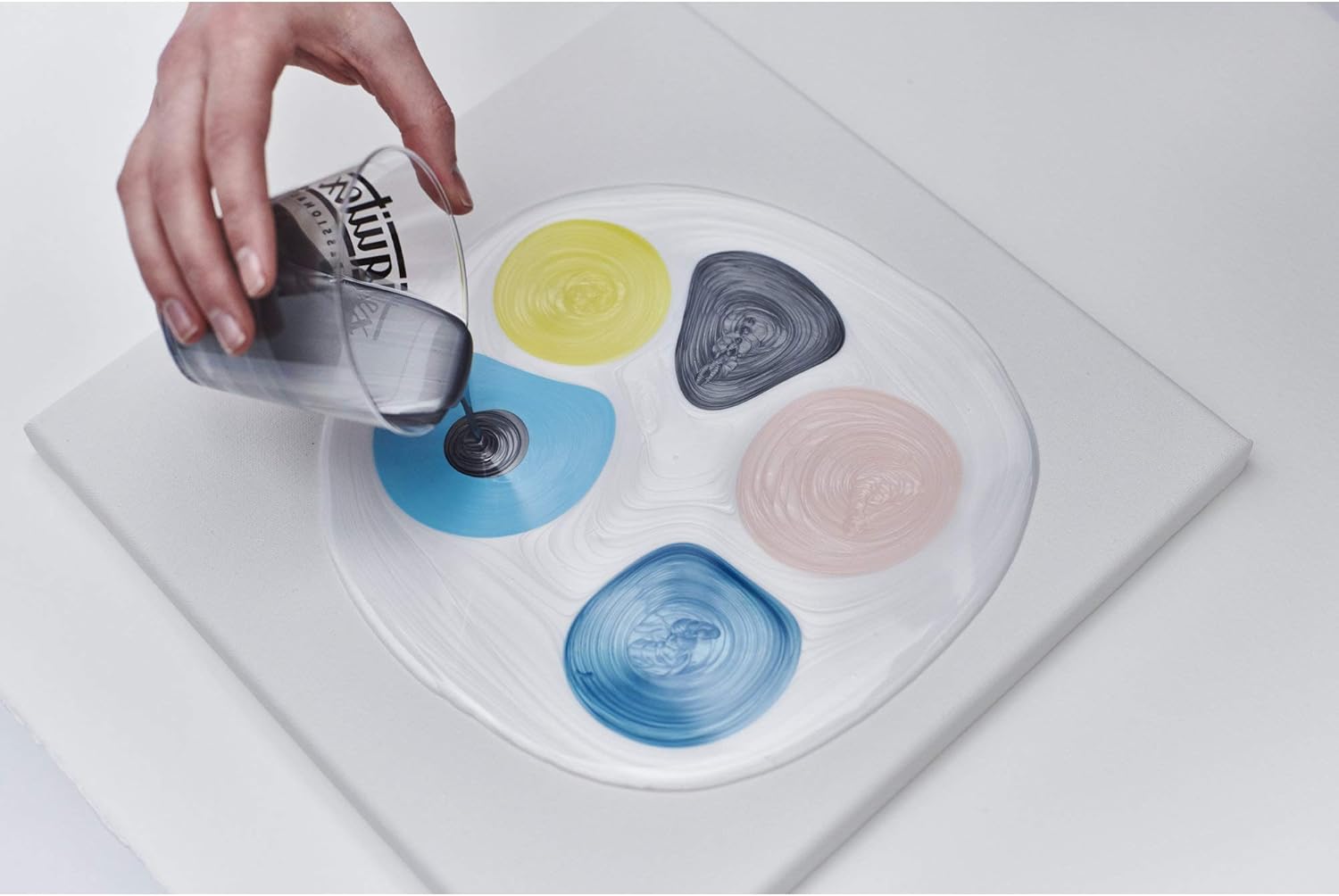 - Pouring medium - for flow technology and casting applications with acrylic paint. Prepare your color for smooth, high gloss, craze-free pours while lowering viscosity and increasing flexibility. All with an iridescent shimmer.