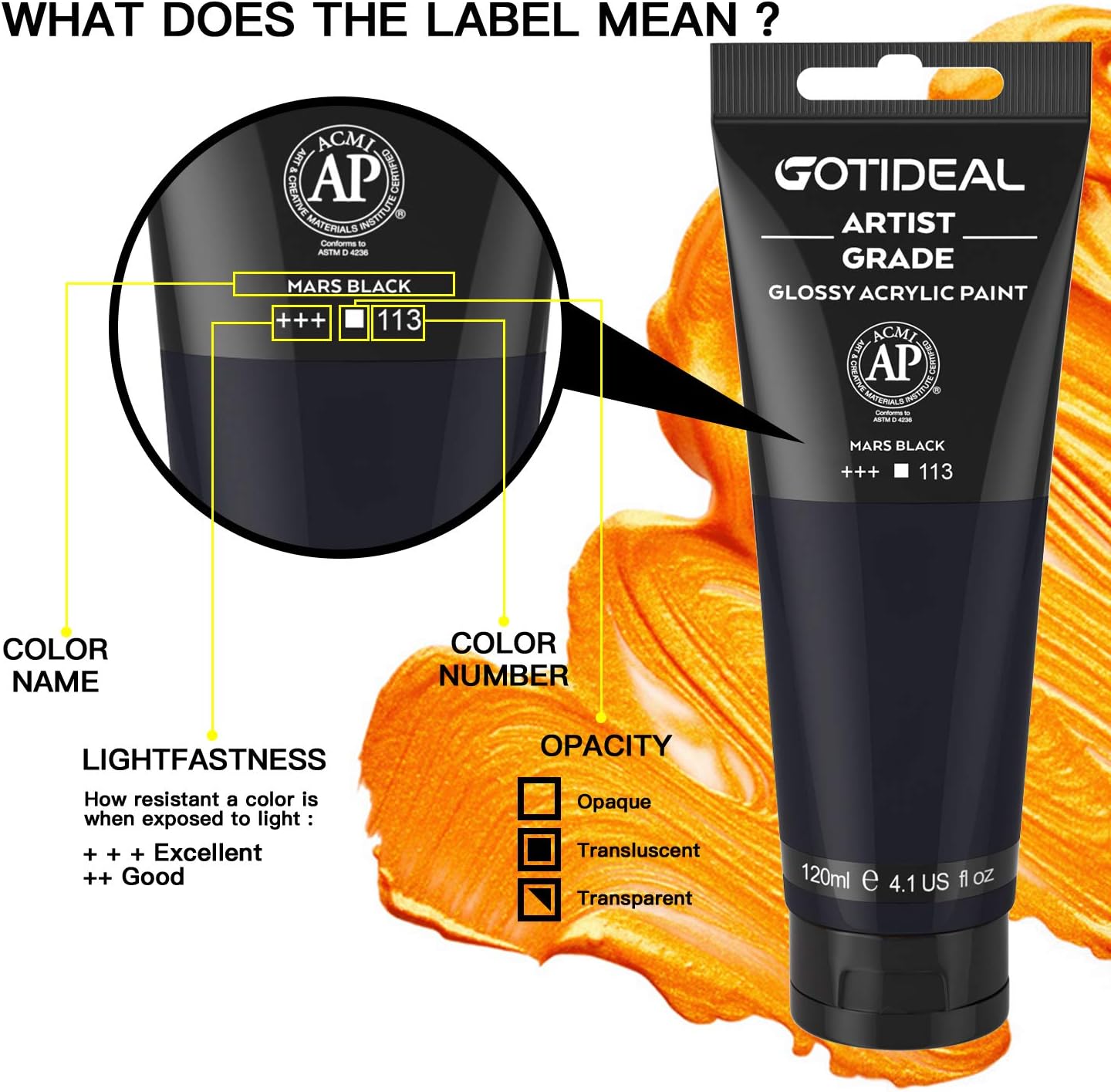 GOTIDEAL Acrylic Paint Mars Black Tubes(120ml, 4.1 oz) Non Toxic Non Fading,Rich Pigments for Painters, Adults & Kids, Ideal for Canvas Wood Clay Fabric Ceramic Craft Supplies (Mars Black)-Glossy