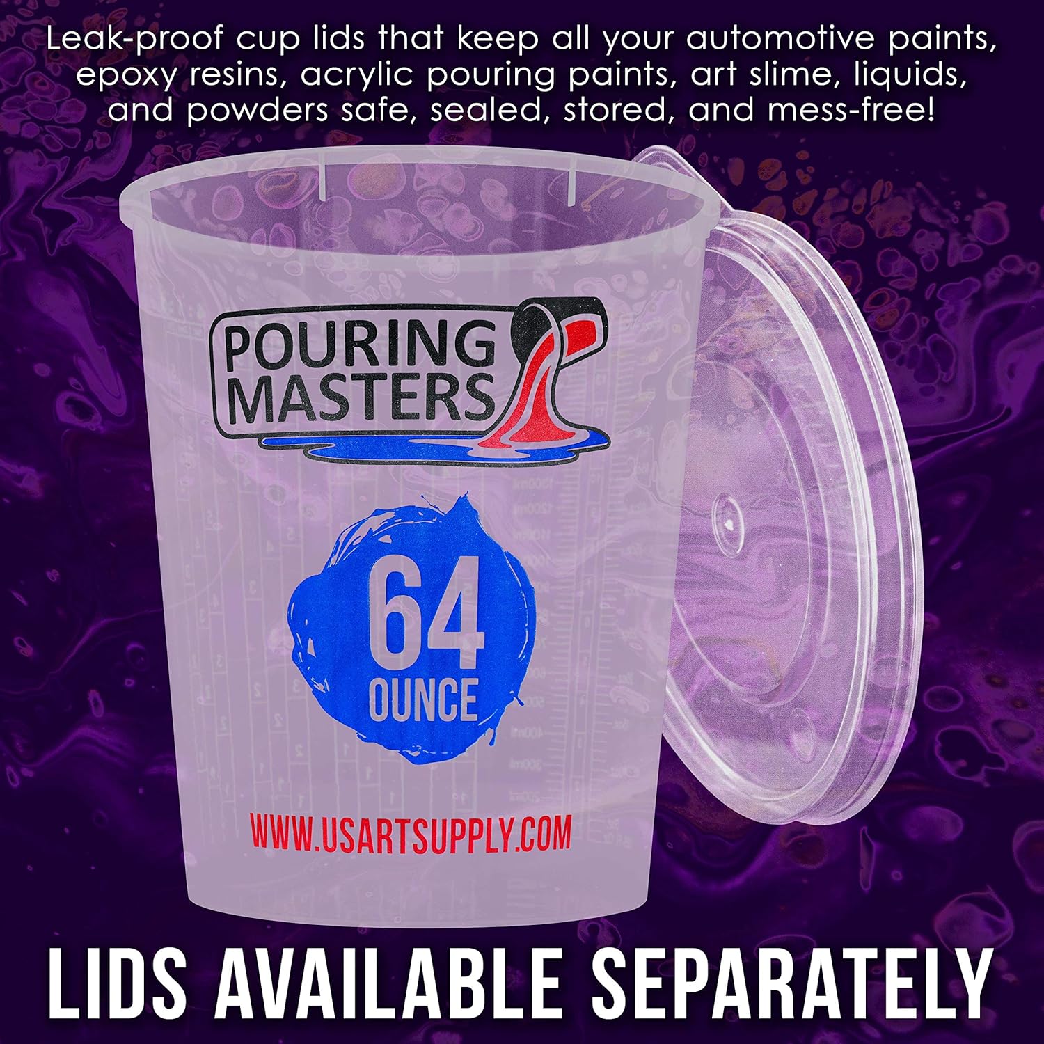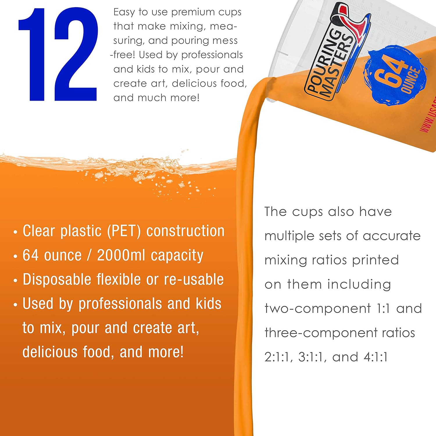 Pouring Masters 64 Ounce (2000ml) Graduated Plastic Mixing Cups (Box of 12) - Paint Mixing Cups for Epoxy Resin, Art, Kitchen, Baking - Measurements in OZ and ML, 4 Different Measuring Ratios 1:1