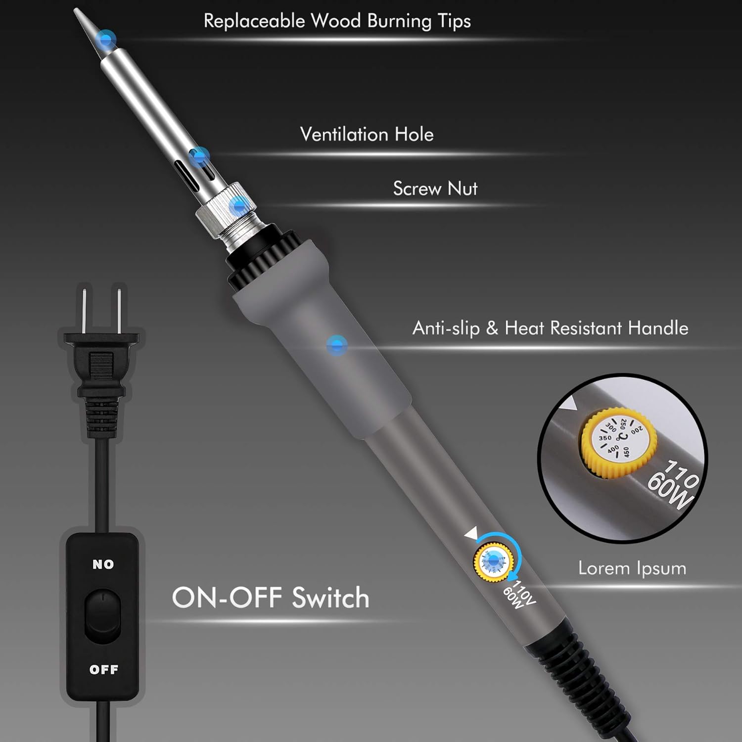 - ADJUSTABLE TEMPERATURE: The burning pen with ON/OFF switch, adjustable temperature from 200°C to 450°C. Heating ceramic technology can quickly heat the wood burning kit to meet your more creative needs. Do not apply too much pressure during use