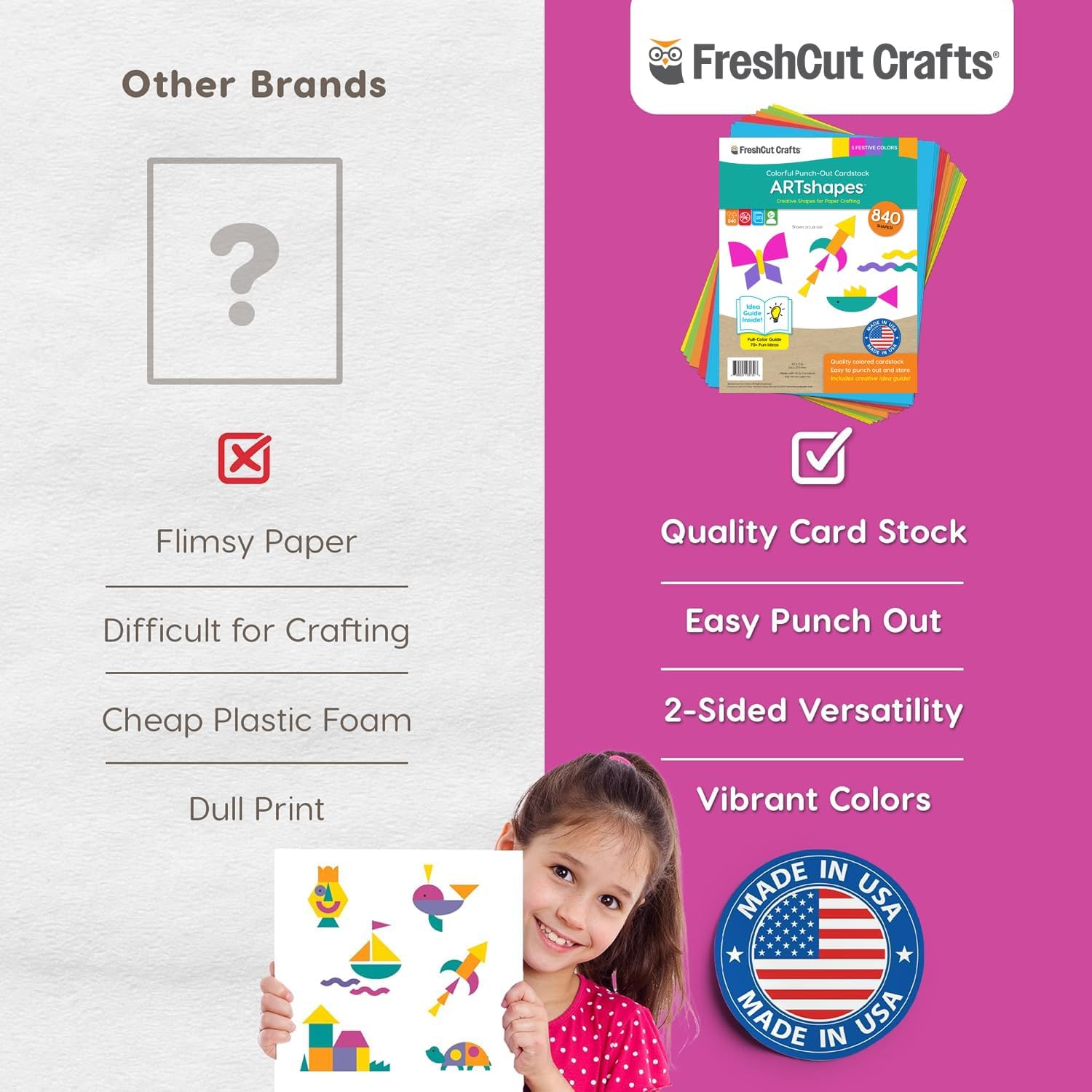 - FEEL-GOOD CRAFTING: At FreshCut Crafts, we're all about crafting with a conscience. Our products are not only about creativity but also about making a positive impact. Proudly family-made in the USA, we use high-quality, acid-free American-made paper that's perfect for preserving memories and creating lasting keepsakes. Our energy-efficient production processes are designed to minimize waste, ensuring that we leave a smaller footprint on the planet.