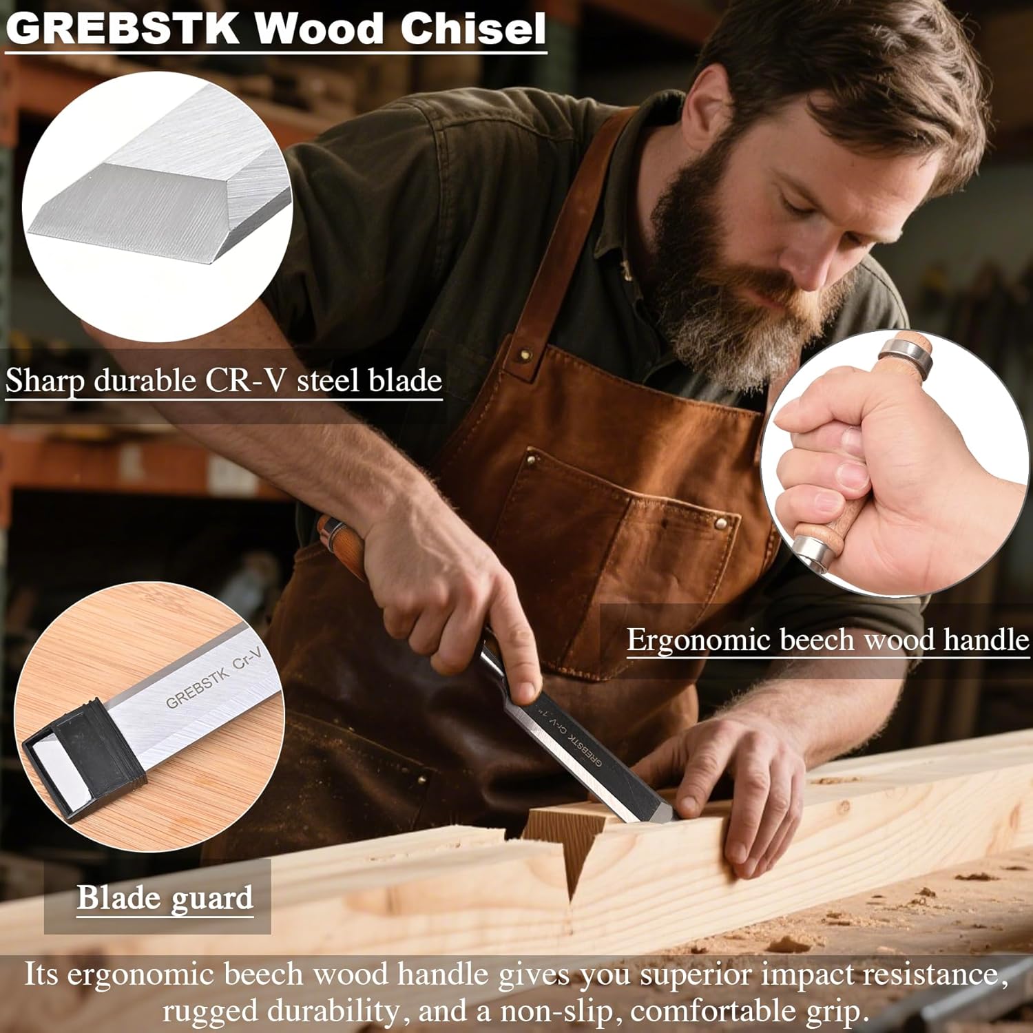 GREBSTK 4 Pcs Wood Chisel Set, CRV Steel Bevel Sharp Edge Bench Chisels with Canvas Bag, Comfortful Beech Handle, for Woodworking and DIY Projects, 9.5"x(1/4", 1/2", 3/4", 1")