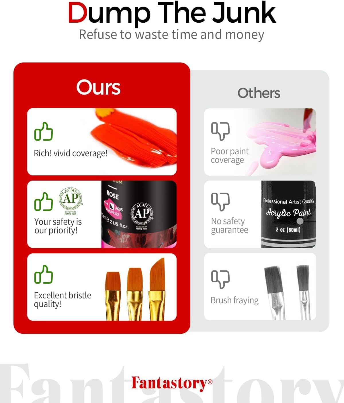 - 🎨PERFECT GIFT CRAFT PAINT- Each of our acrylic paint bottles is safe, non-toxic and has professional quality so it can be rich gift for adults, for both beginners and artists with great experience in arts. Adults love the versatility of our waterproof acrylic paint set. Fantastory acrylic paint sets with exquisite packging box will be a great gift idea at Christmas, Halloween, Birthday and more festivals.