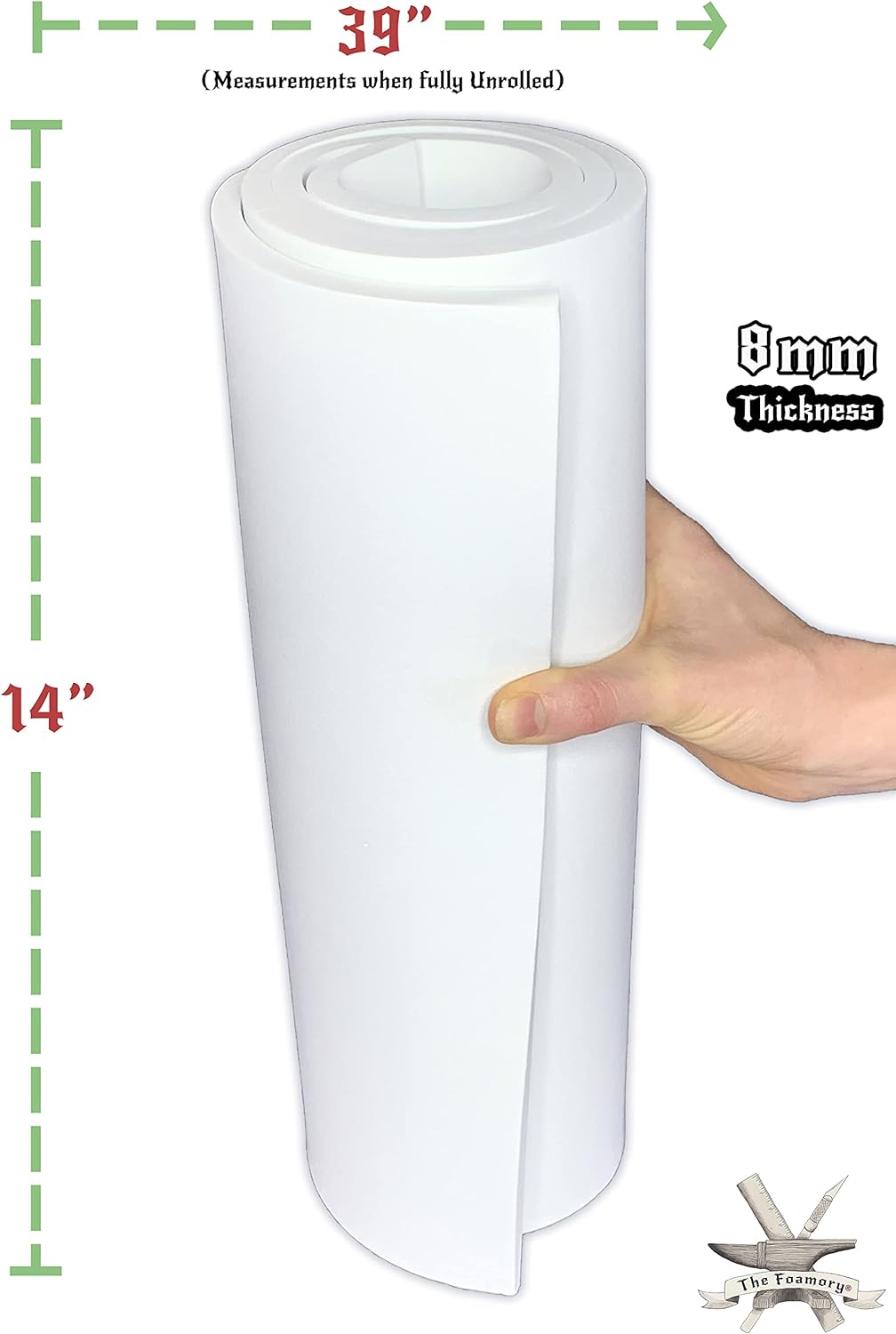 - 8MM THICKNESS, 14 X 39 INCH CUT: 8mm is great for thicker armor, large sized accessories and designs. The 14 x 39 inch cut allows for bigger designs, less piecing together, fewer seems and more pieces out of one sheet.