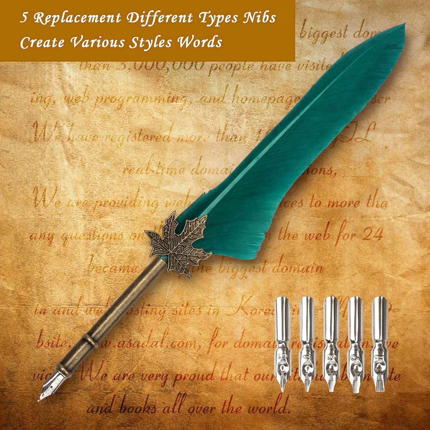 AHIER Quill Pen and Ink Set, Feather Pen Quill Pen Set Includes 5 Steel Replacement Nibs,Pen Nib Base and Dip Ink Bottle for Antique Calligraphy