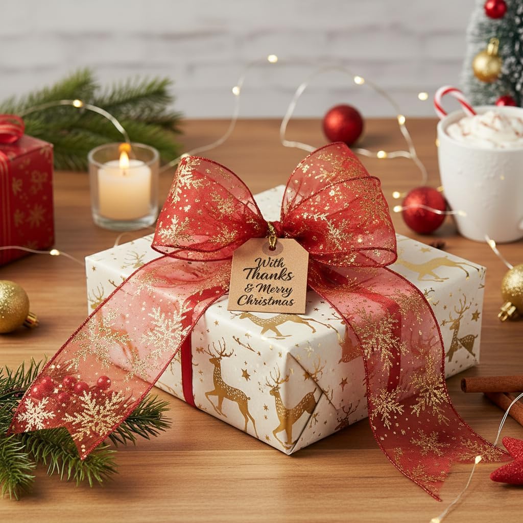 - OCCASION - Our Organza with Red Glitter Snowflakes Wired Ribbon 2.5" are very easy to match and suitable for birthdays, party decorations, Mother's Day, Valentine's Day, Easter, Independence Day, Halloween, Christmas, New Year's gifts, Wedding decorations, Baby showers etc.