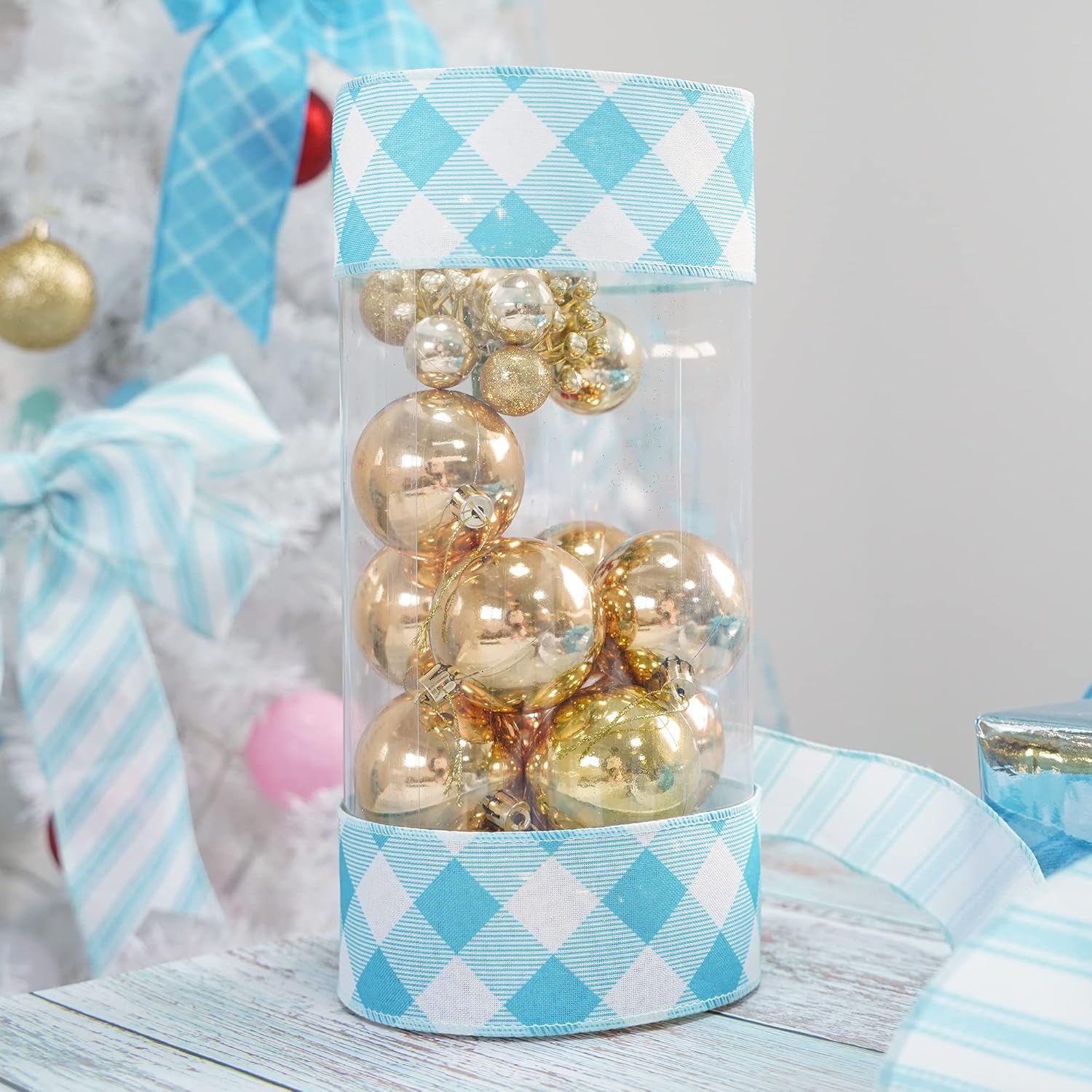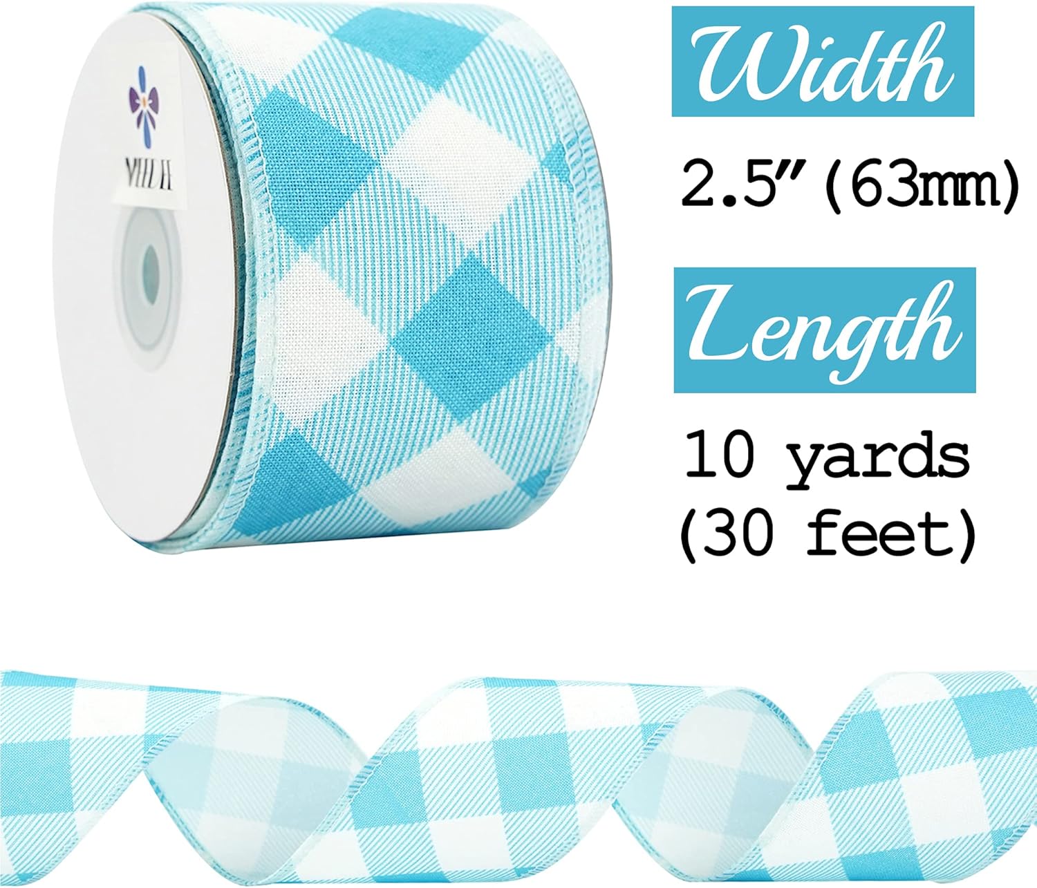 - Classic Pattern: This wired ribbon is designed with baby blue and white gingham pattern for wreaths or bows 2.5" x 10 yards by the roll. The ribbon has an blue threaded wired edge. Ribbon is shipped on the spool and would be beautiful for all of your craft needs, great product for wreath makers!