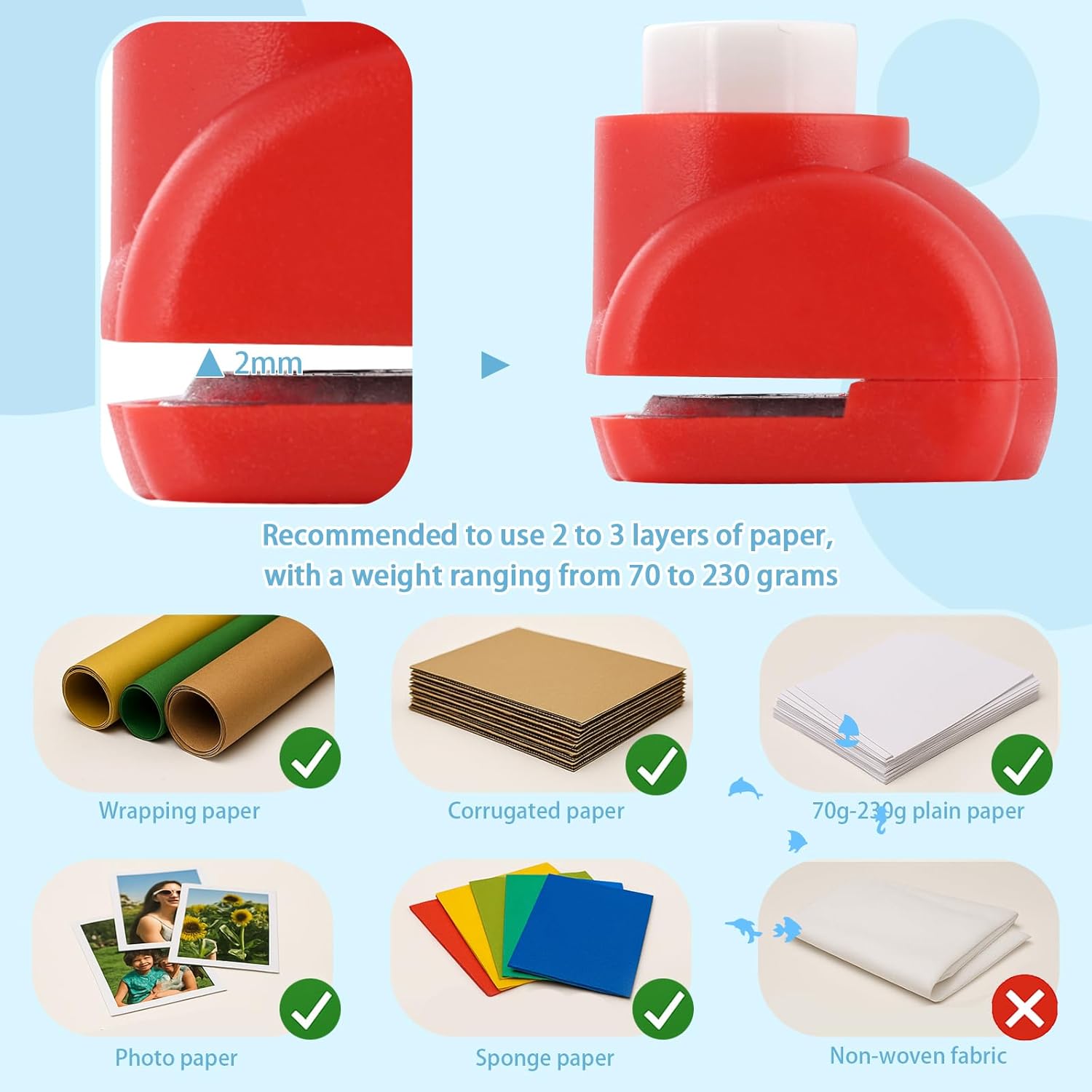 - RECOMMENDATION - Our paper punch is made of high-grade zinc alloy and ABS, firm and durable, nontoxic and odorless.You can use plain paper, EVA foam, aluminum foil, craft paper, etc.Kraft paper with a thickness of less than 0.3 mm is the best.