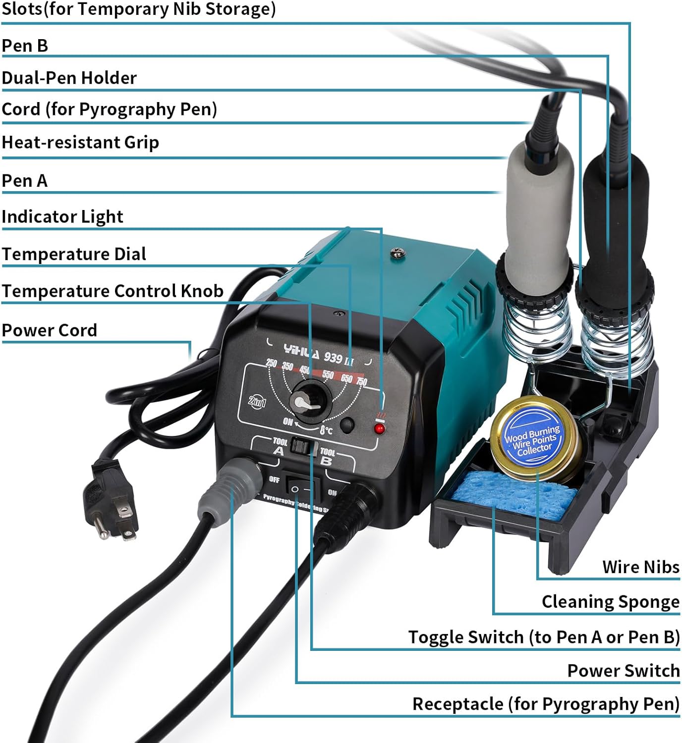 - Dual-Pen and More Efficient. You can freely alternate between pen A and pen B with the Toggle Switch and use two types of wire nibs on two pens for wood-burning, and you don't need to install the pen nibs repeatedly for one piece of work. It also reduces the hassle of waiting for the nib to cool down before changing. The Dual-Pen feature lets you enjoy a smoother wood-burning experience with more fun.