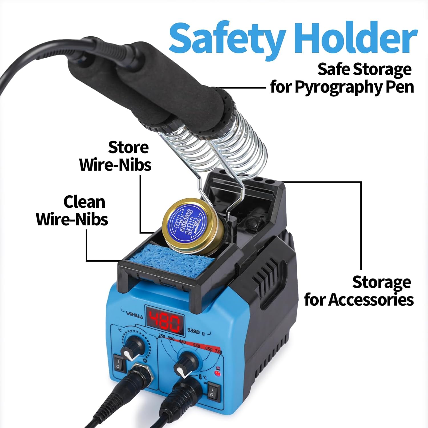 YIHUA 939D-II Pyrography Pen Wood Burning Kit Station 2-in-1 Solid-Point 200~480°C (with Temp Display)/Wire-Nib 250~750°C with 20 Nibs, Solid Points, 1 Stable Pen Holder, 2 Scrap Wood (Blue)
