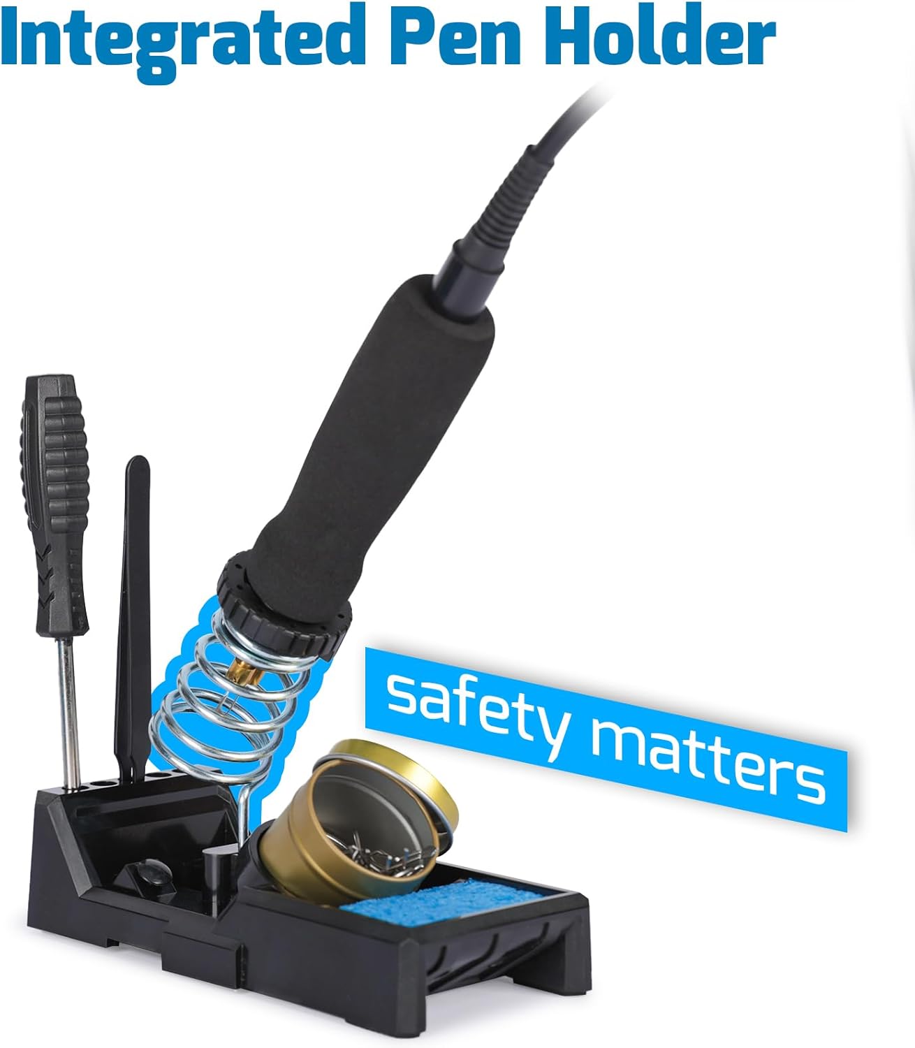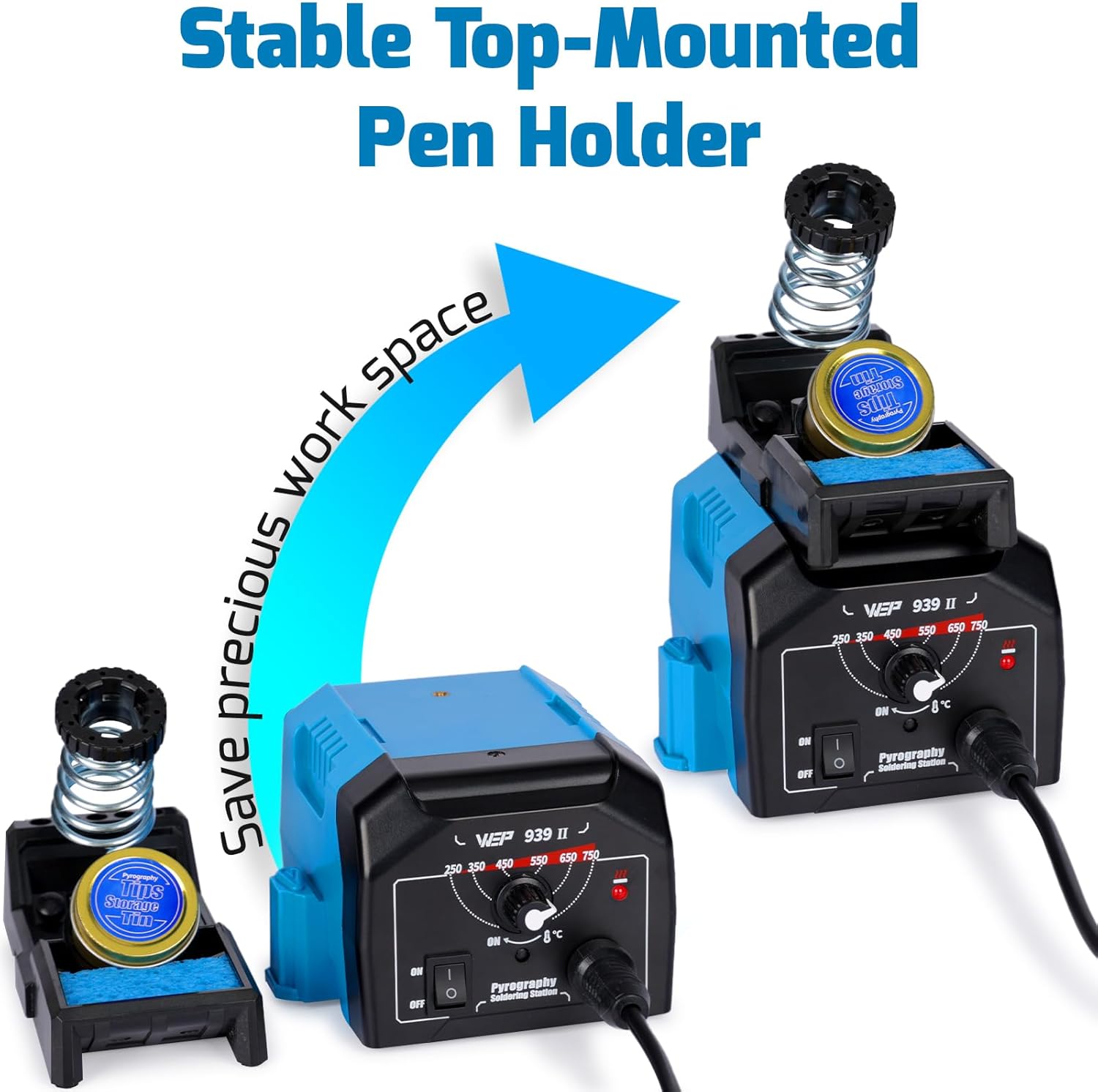 - The woodburing pen holder can be mounted on top of the station to save precious work space, and the holder has multiple storage slots to store tools such as a screw driver, a pair of tweezers, and more. You can wet the sponge included to clean the tip or cool the tip quickly