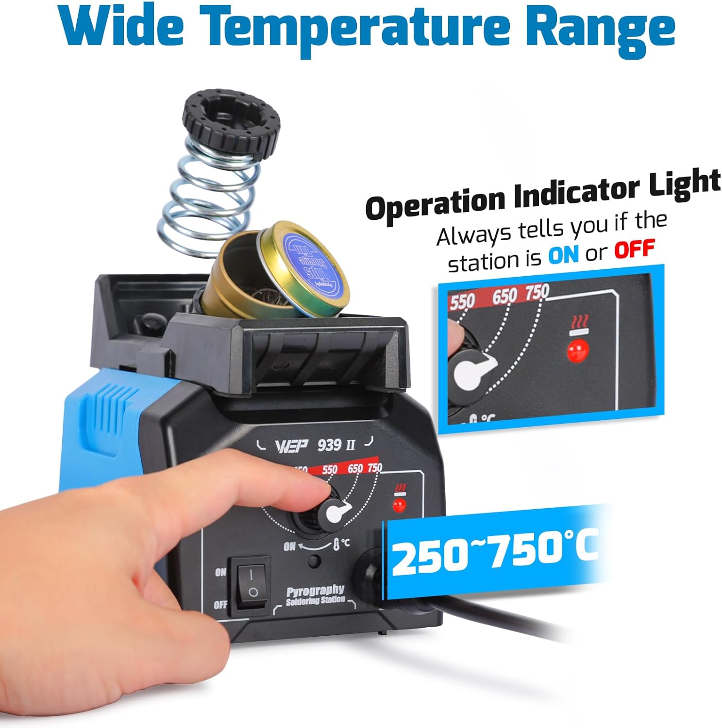 - The temperature can be adjusted from 250~750°C / 482~1382°F for a wide range of pyrography artworks on different materials. The wood burner has a built-in operation indicator so you’ll always know if the wood burner is turned ON or OFF. NOTE: It takes about 1 to 2 minutes for the wire - nib pen to heat up, please wait for the tip to heat up completely before drawing. You can learn more about pyrography in the WEP'S GUIDE TO PYROGRAPHY section of our brand store