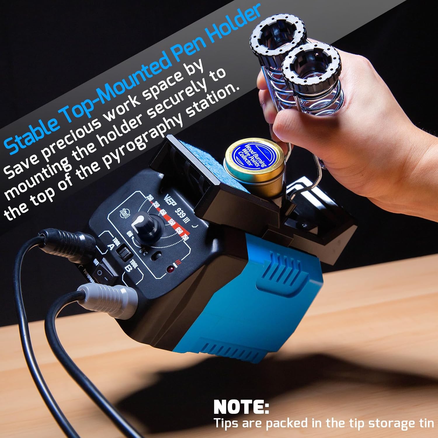 - This woodburner is coupled with a safe pen holder that fits both Pen A and Pen B securely in the holder. This holder also has built-in slots and storage space for the tip storage tin, cleaning sponge, tweezers and more. To save precious desk space, your can mount the holder on top of the station via the screw included