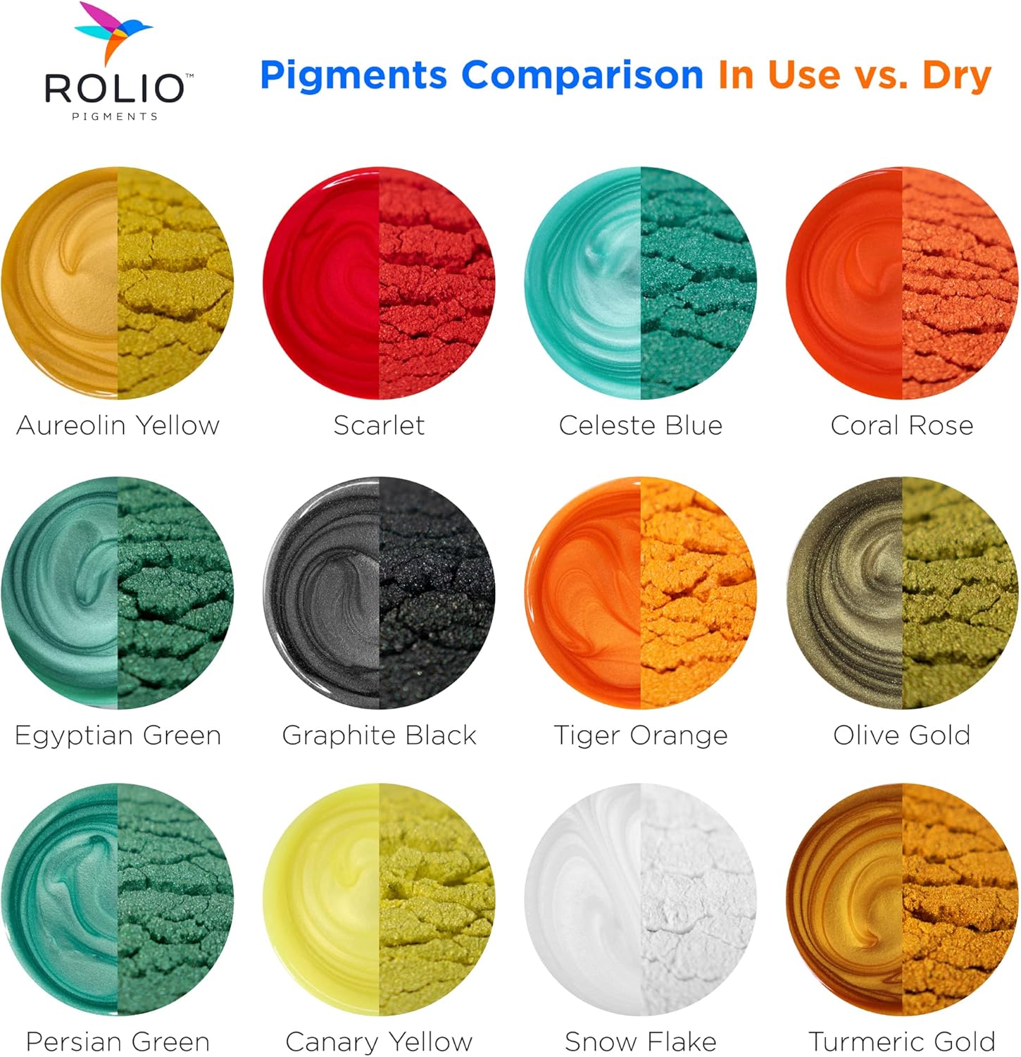 - FINE PIGMENTS - Rolio’s fine pigments are formulated to be safe and easy to use for any project. With 12 high intensity colors you can mix to create any color you can imagine! Comes with: Graphite Black, Noble White, Egyptian Green, Celeste Blue, Persian Green, Olive Gold, Canary Yellow, Aureolin Yellow, Turmeric Gold, Tiger Orange, Coral Rose, Scarlet - Rolio