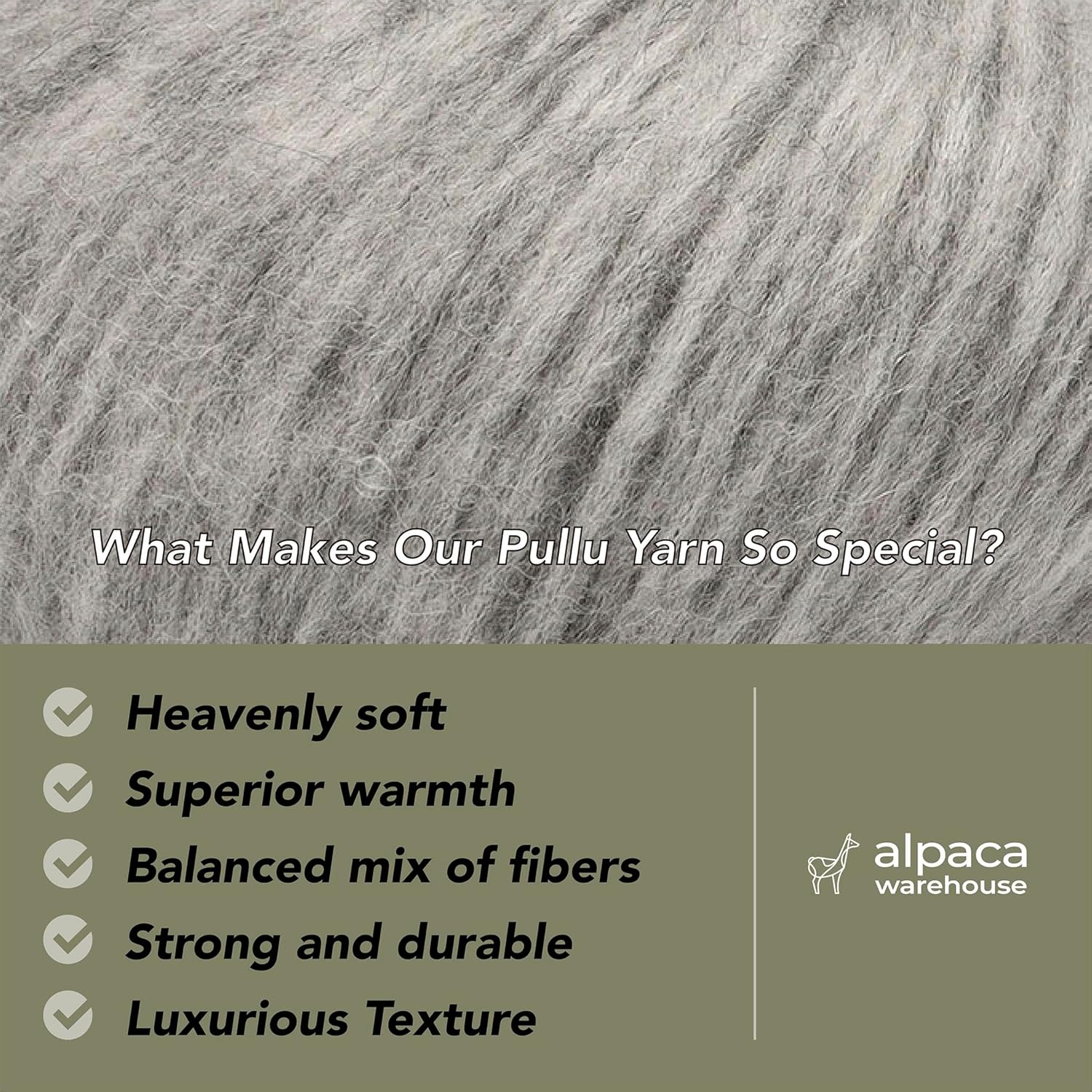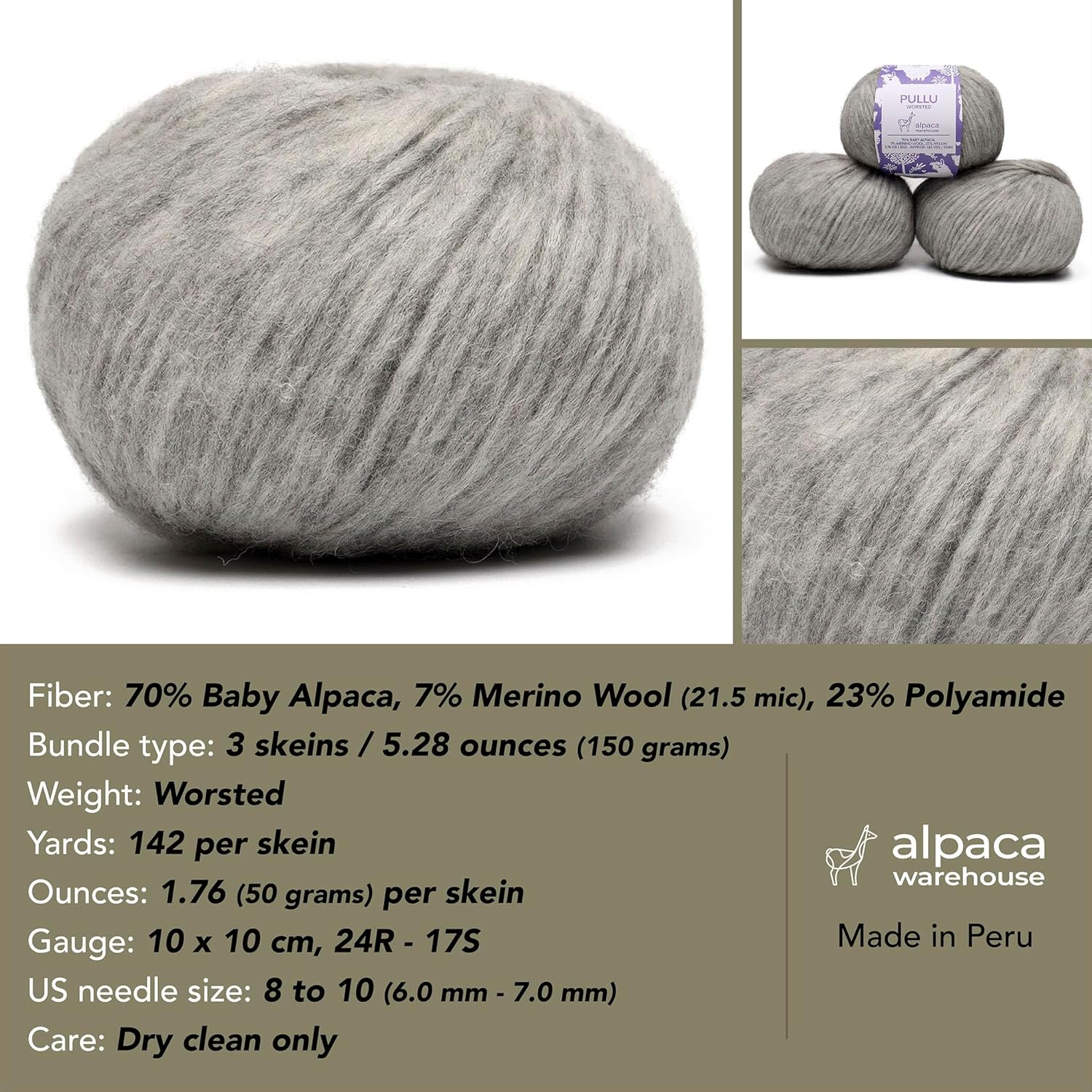 - Baby Alpaca and Merino Wool blend: Sourced directly from a manufacturer in Peru, each skein of yarn is custom-made for Alpaca Warehouse! As a result, we’re able to offer a premium wool that’s beautifully unique, surprisingly strong, and even hypoallergenic. Our yarn composition is 70% Baby Alpaca, 7% Merino Wool (21.5 mic.), 23% Polyamide.