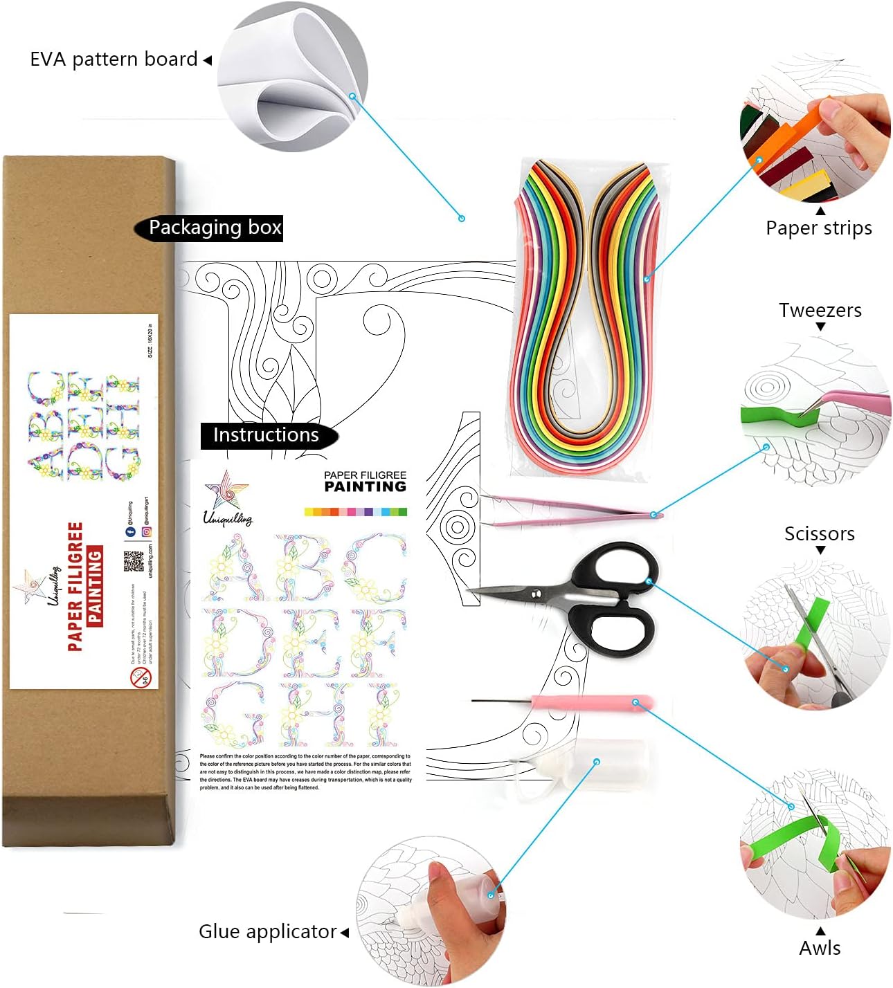 - 【Quilling Kit Contains】 EVA pattern board, paper strips set, instructions, and tool kit. (Tool Kit: Glue applicator, tweezers, awls, scissors. Note: there is no glue in the glue bottle. Recommendation: white latex. )