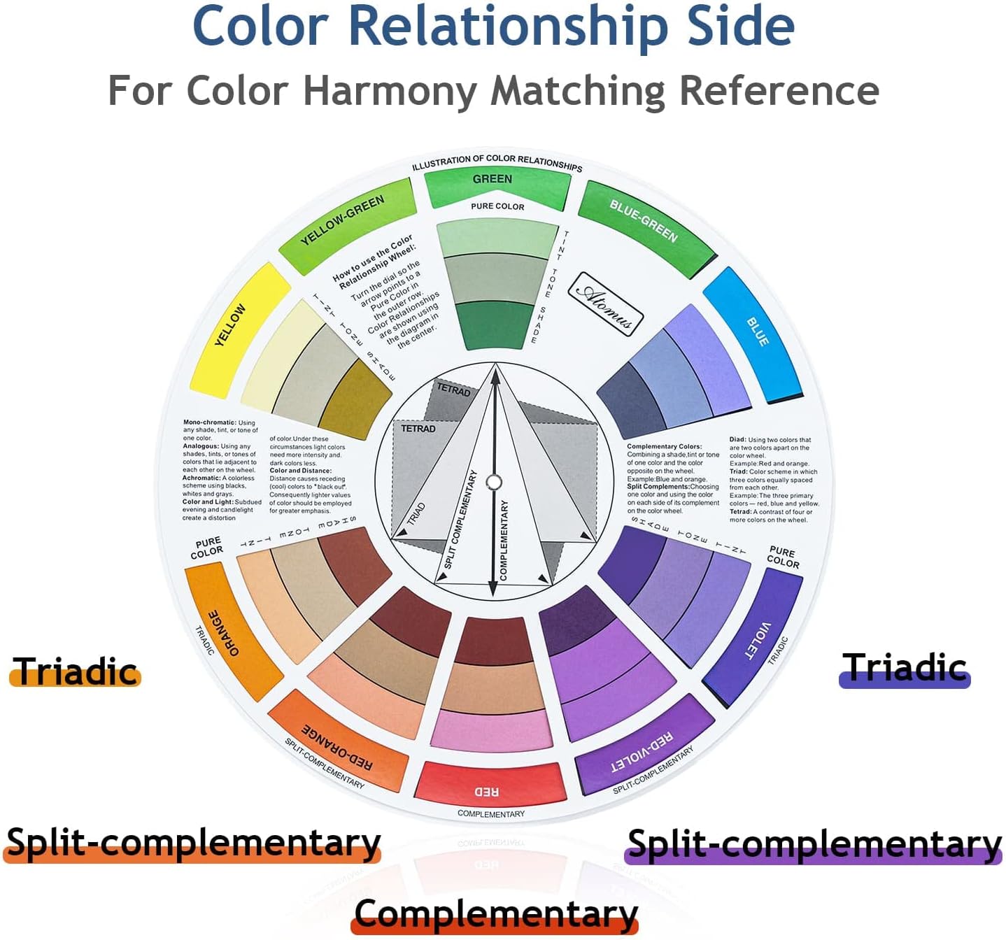 - Color Mixing Guide:The color wheel's front side shows basic principles. Just spin the wheel and you will find the color mixing results in the window. The back side indicates the color relationships such as complementary colors and triad colors. It gives you more color combo inspiration when creating