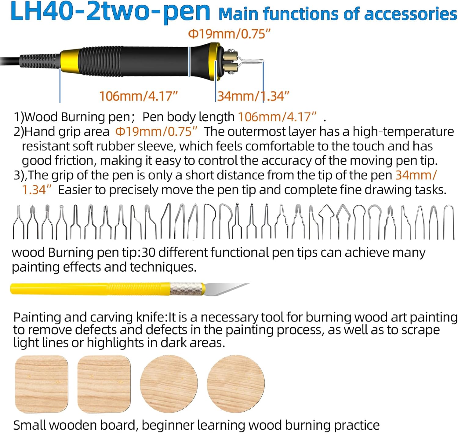 - WOOD BURNER TOOL THE NON SLIP HEAT INSULATION PEN: The handle is made of safe flame retardant and fireproof heat insulation material, heat resisting bakelite block the heat conducted from the pen point to the pole,with a layer of soft non-slip silicone cover,The ergonomic design is based on the characteristics of handwritten painting. The diameter is 0.75 inches,and weighs only 33 grams, and it is comfortable and easy to control the movement of the pen when holding the hand. slip heatproof soldering iron has good toughness,Long service life. When replacing the pen tip, please use a screwdriver to tighten the screws to avoid poor contact between the pen tip and the terminal.