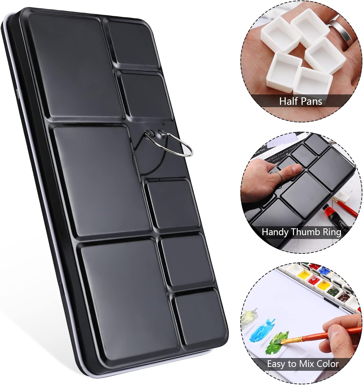 - 【ENAMELED METAL WATERCOLOR PALETTE】Watercolor paint palette is made of tin plate material, features a black enamel exterior and white enamel interior with exquisite workmanship, made by premium material, rust-proof, sturdy and easy to clean.