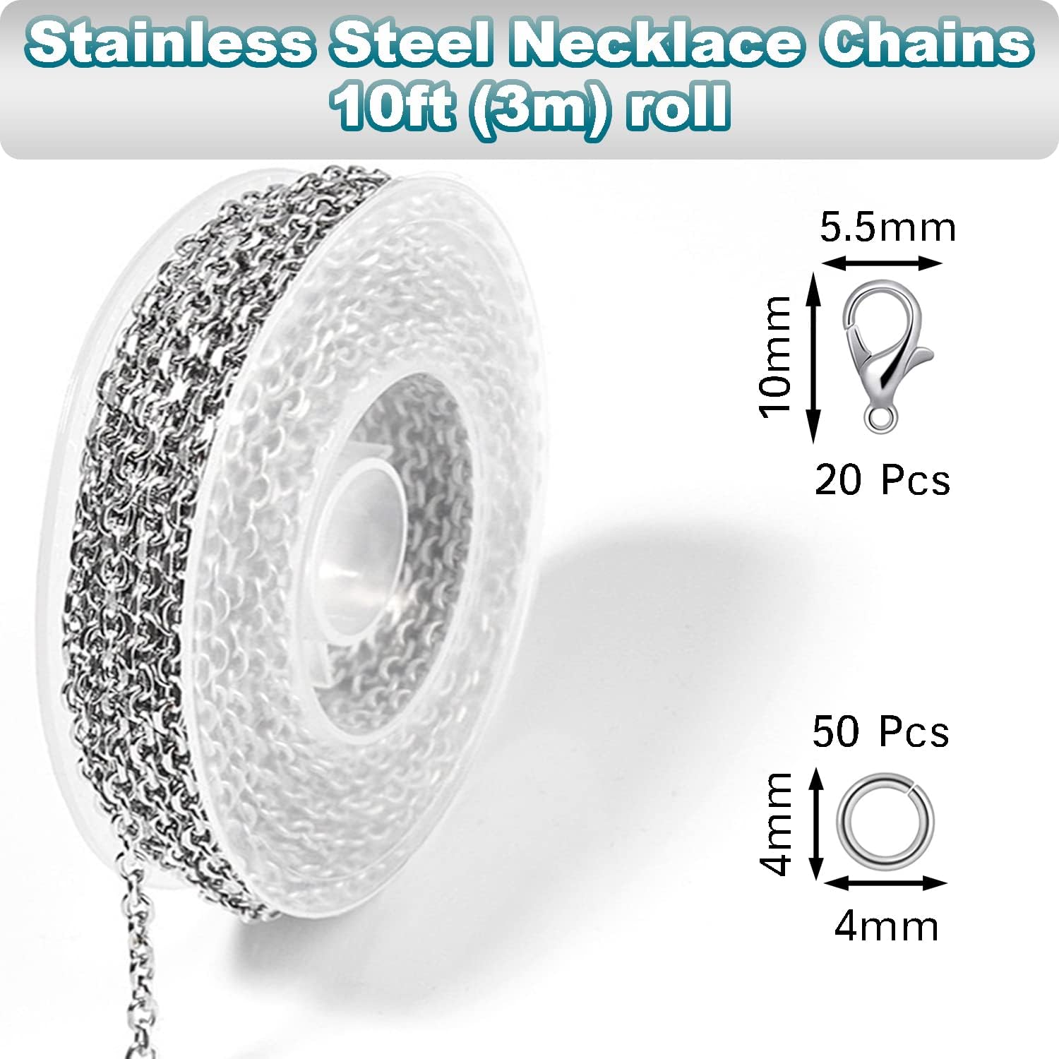 - 33 FEET ROLL SET: 33ft (10m) Silver Stainless Steel Chain Spool - 20 Silver Stainless Steel Lobster Clasps - 50 Silver Stainless Steel Jump Rings.