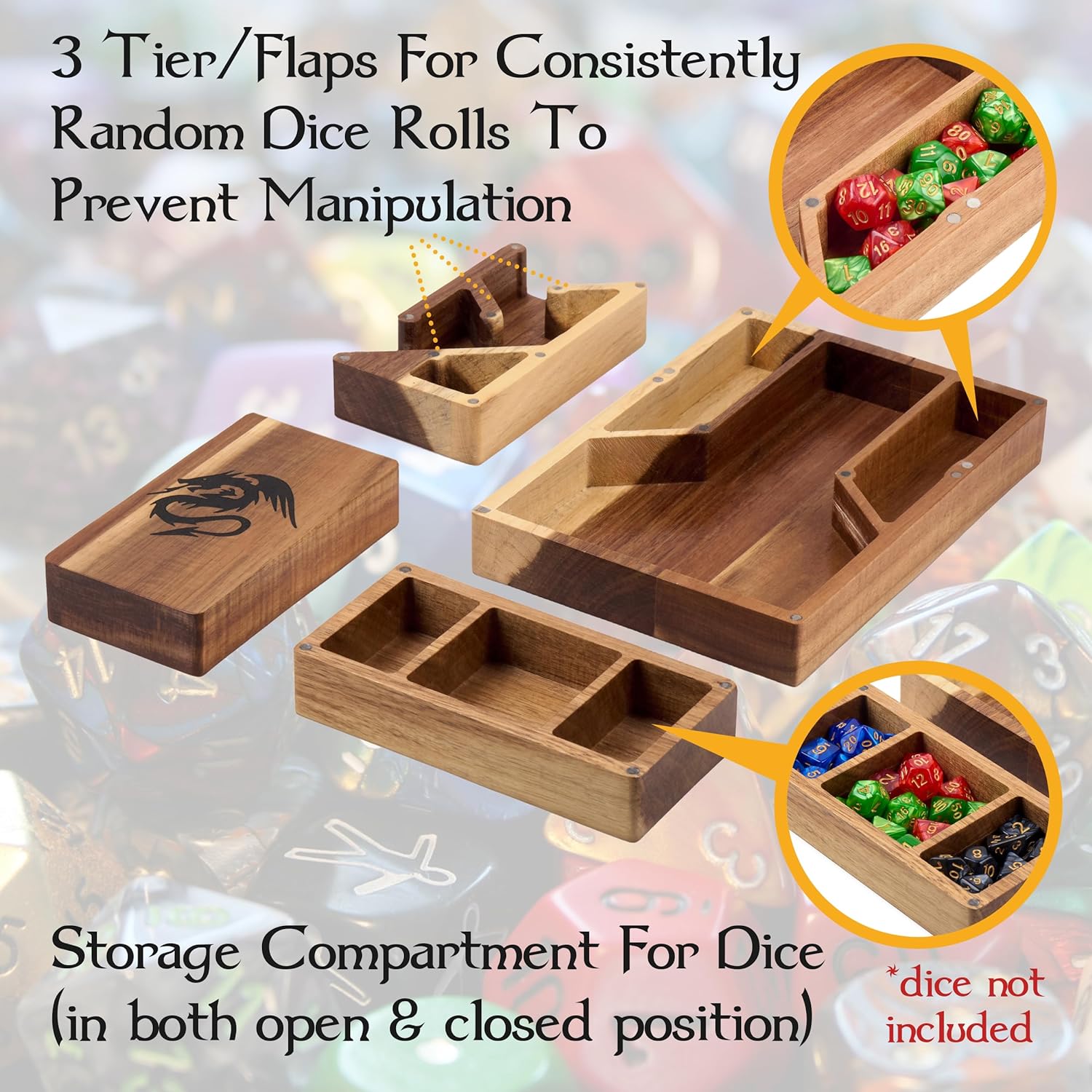 - STAND OUT FROM THE REST - With its innovative magnetic design, this dice tower can transform from a wooden box to a dice tower in seconds. To add a premium touch to it, the item is produced with high quality Acacia wood instead of ordinary bamboo or acrylic materials.