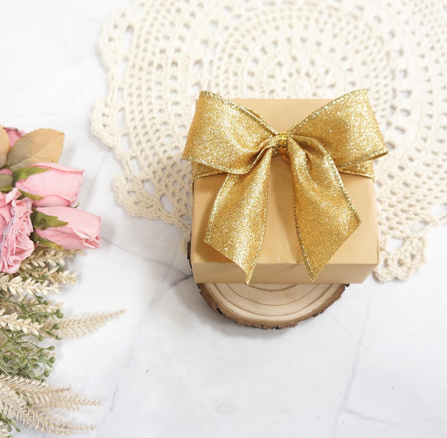 - EASY TO USE - The 10-yard long Glitter Wired Ribbon 1.5" is enough for all the decorating and accenting your DIY Crafts. The Glitter Wired Ribbon 1.5" is easy to use and won’t tangle. It can be tied or glued on gift packages and DIY craft projects such as car and chair bow, wreath, flower bouquet.