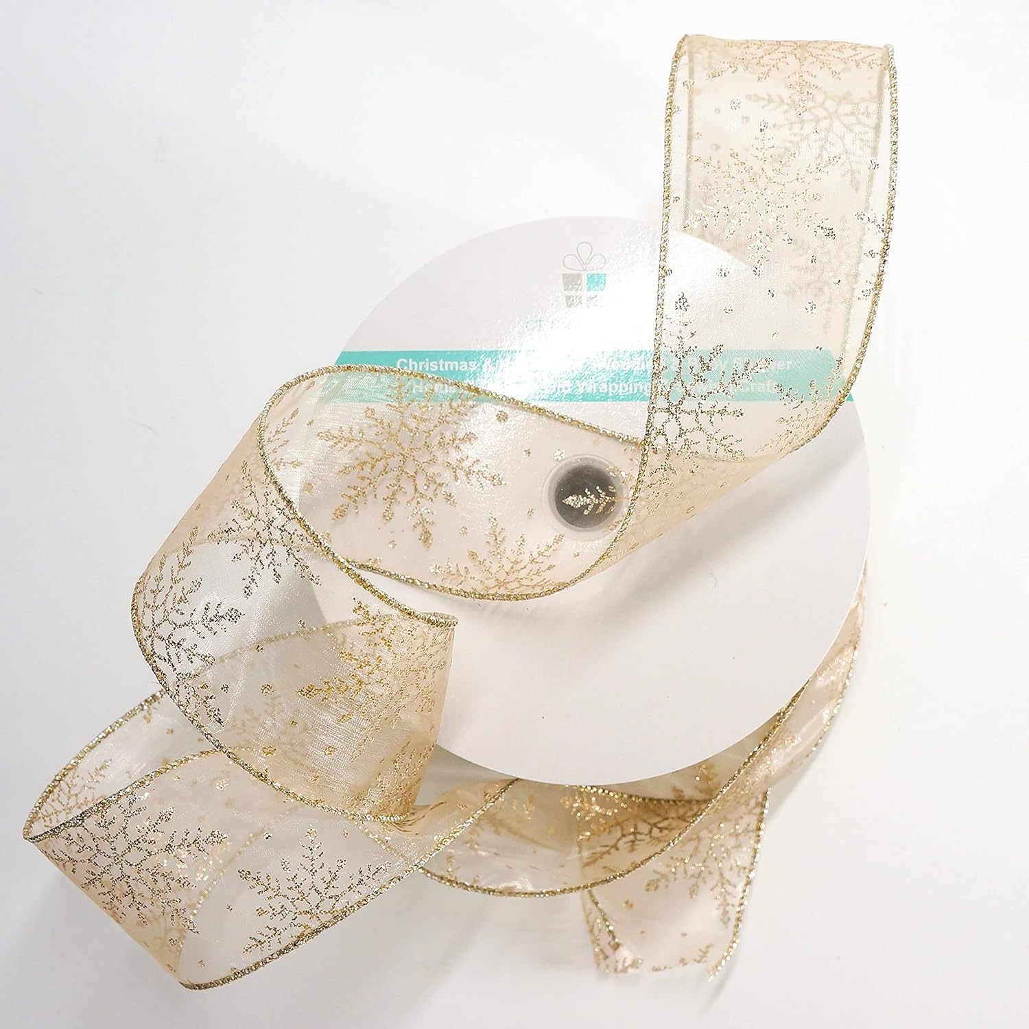 - EASY TO USE - The 50-yard long Organza with Champagne Gold Glitter Snowflakes Wired Ribbon 2.5" is enough for all the decorating and accenting your DIY Crafts. The Organza with Champagne Gold Glitter Snowflakes Wired Ribbon 2.5" is easy to use and won’t tangle. It can be tied or glued on gift packages and DIY craft projects such as car and chair bow, wreath, flower bouquet.