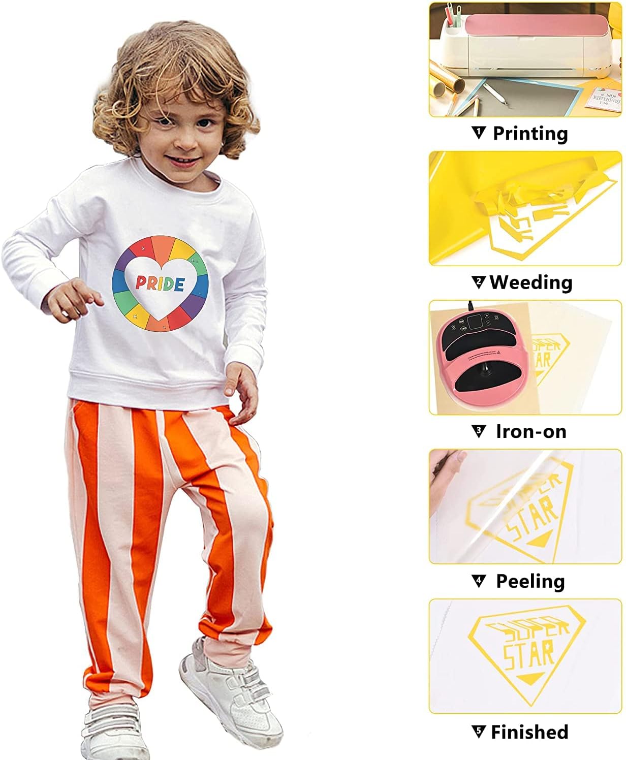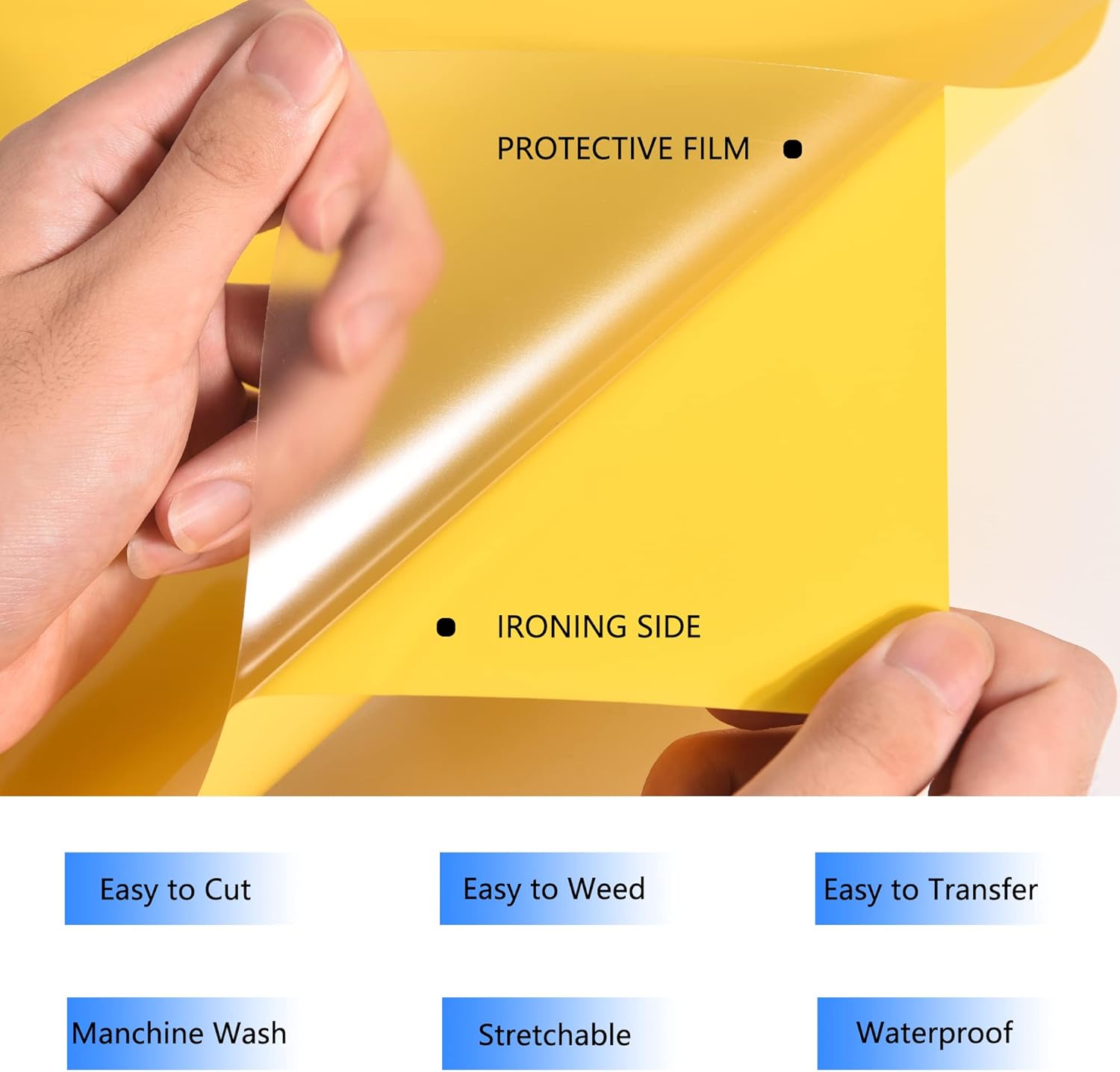 - Glossy heat transfer vinyl HTV: Our Yellow htv iron on vinyl is made out of the highest quality polyurethane that is incredibly strong, durable and vibrant fine Using the special technology, the htv is thin and extremely durable and soft. The whole weeding process just like a breeze at the help of sticky back.