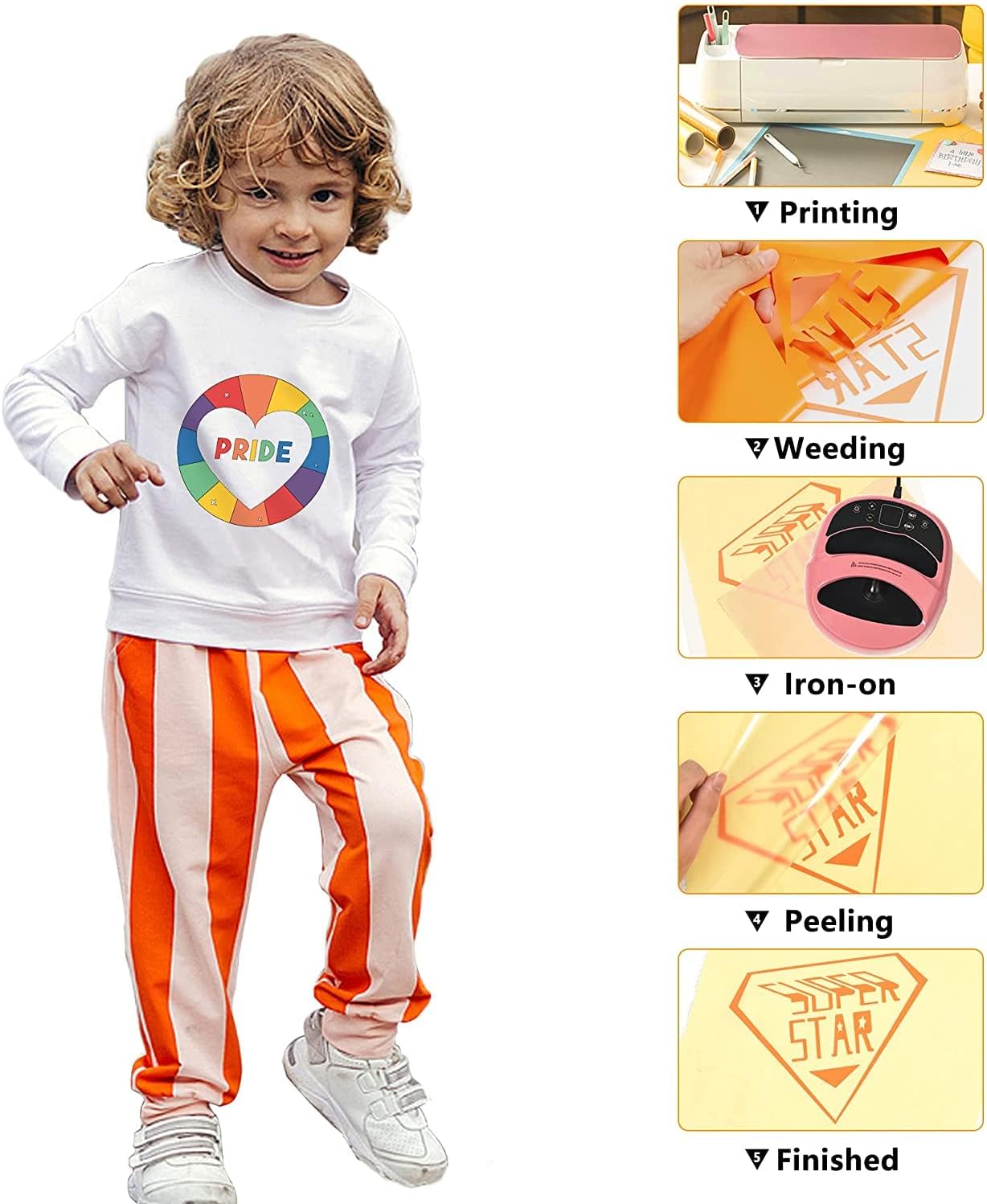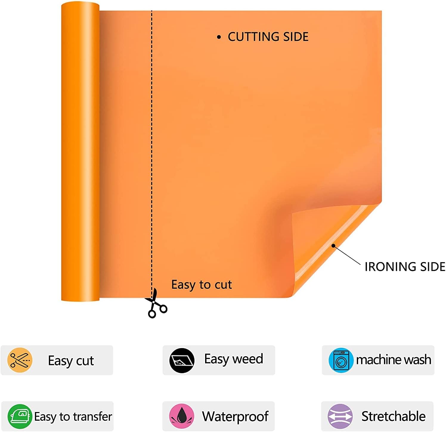 - Glossy heat transfer vinyl HTV: Our Orange htv iron on vinyl is made out of the highest quality polyurethane that is incredibly strong, durable and vibrant fine Using the special technology, the htv is thin and extremely durable and soft. The whole weeding process just like a breeze at the help of sticky back.