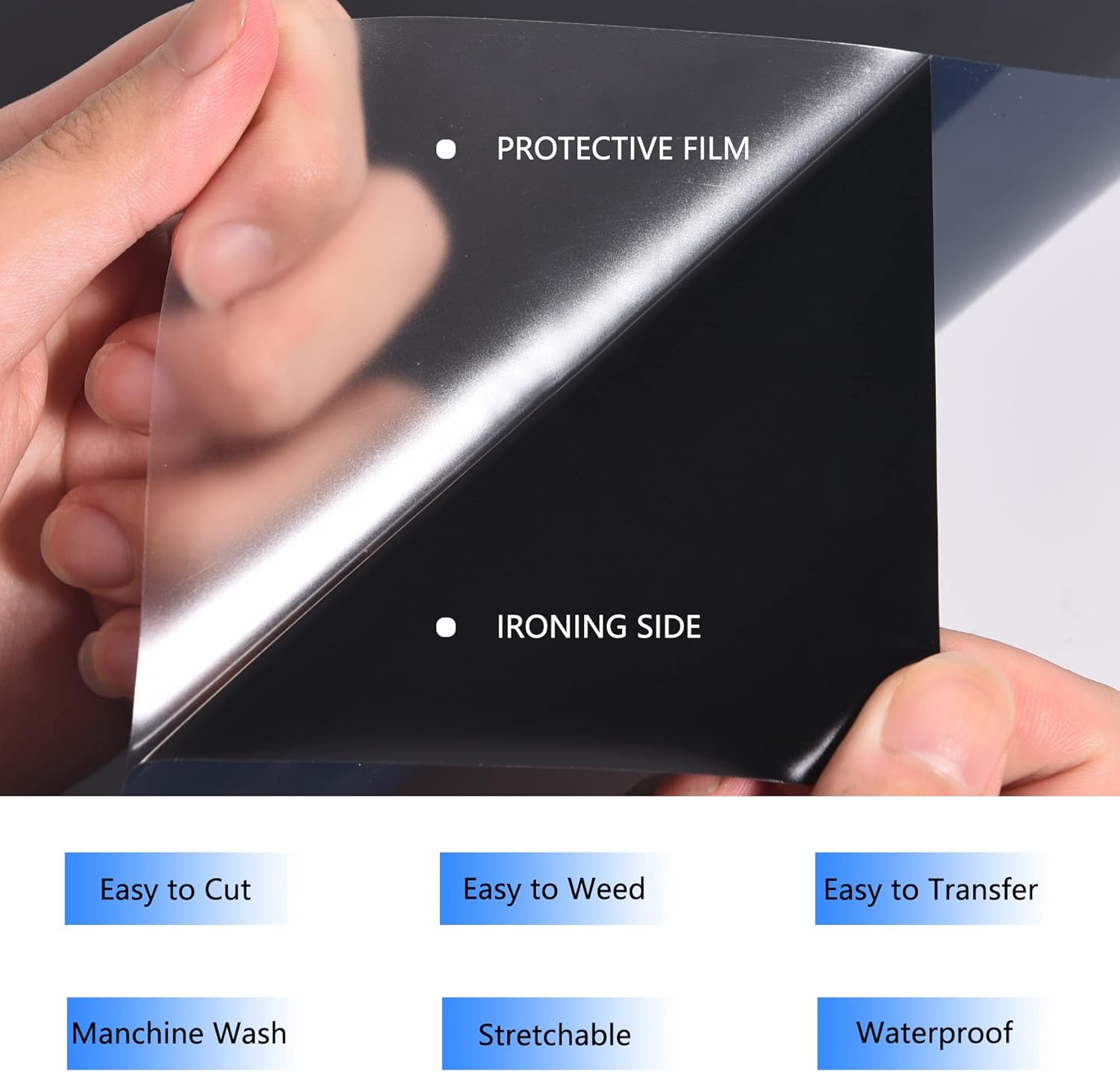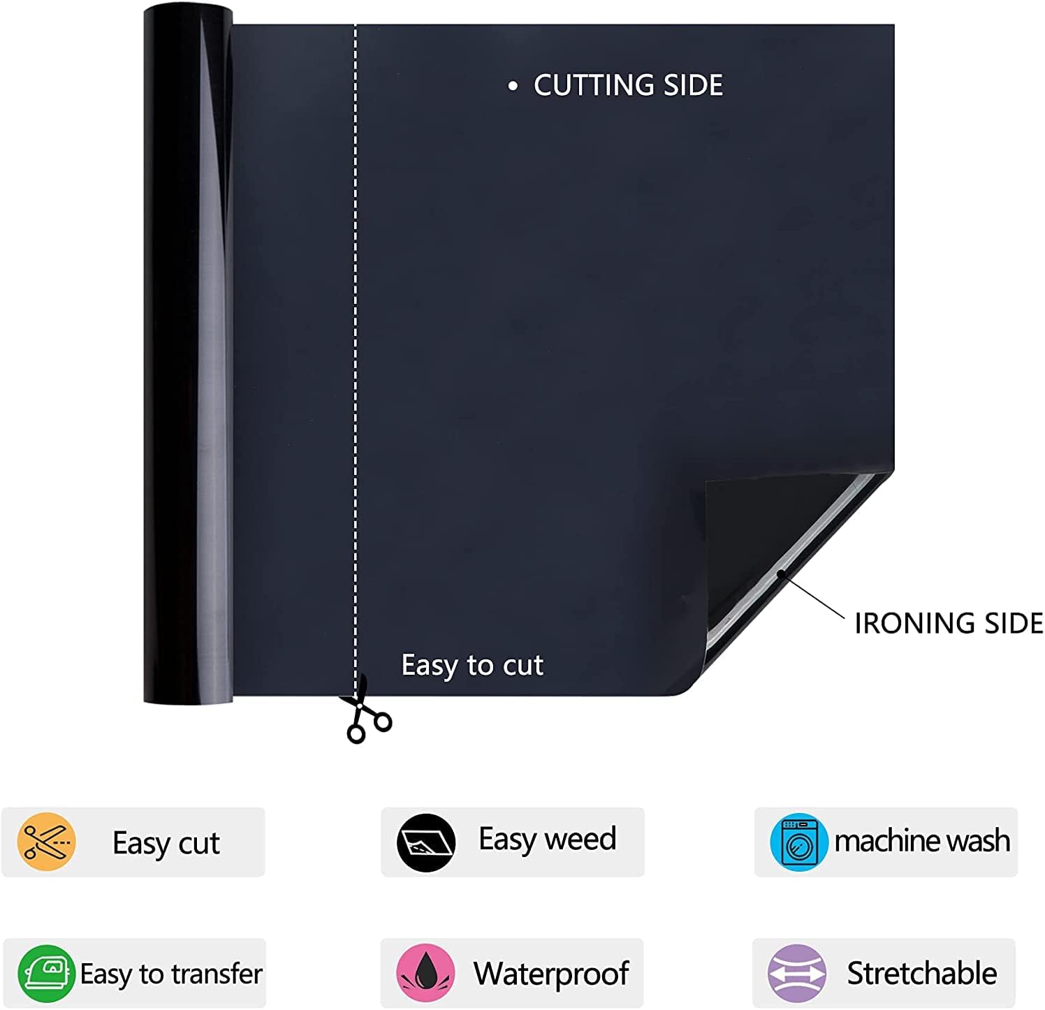 - Glossy heat transfer vinyl HTV: Our Black htv iron on vinyl is made out of the highest quality polyurethane that is incredibly strong, durable and vibrant fine Using the special technology, the htv is thin and extremely durable and soft. The whole weeding process just like a breeze at the help of sticky back.