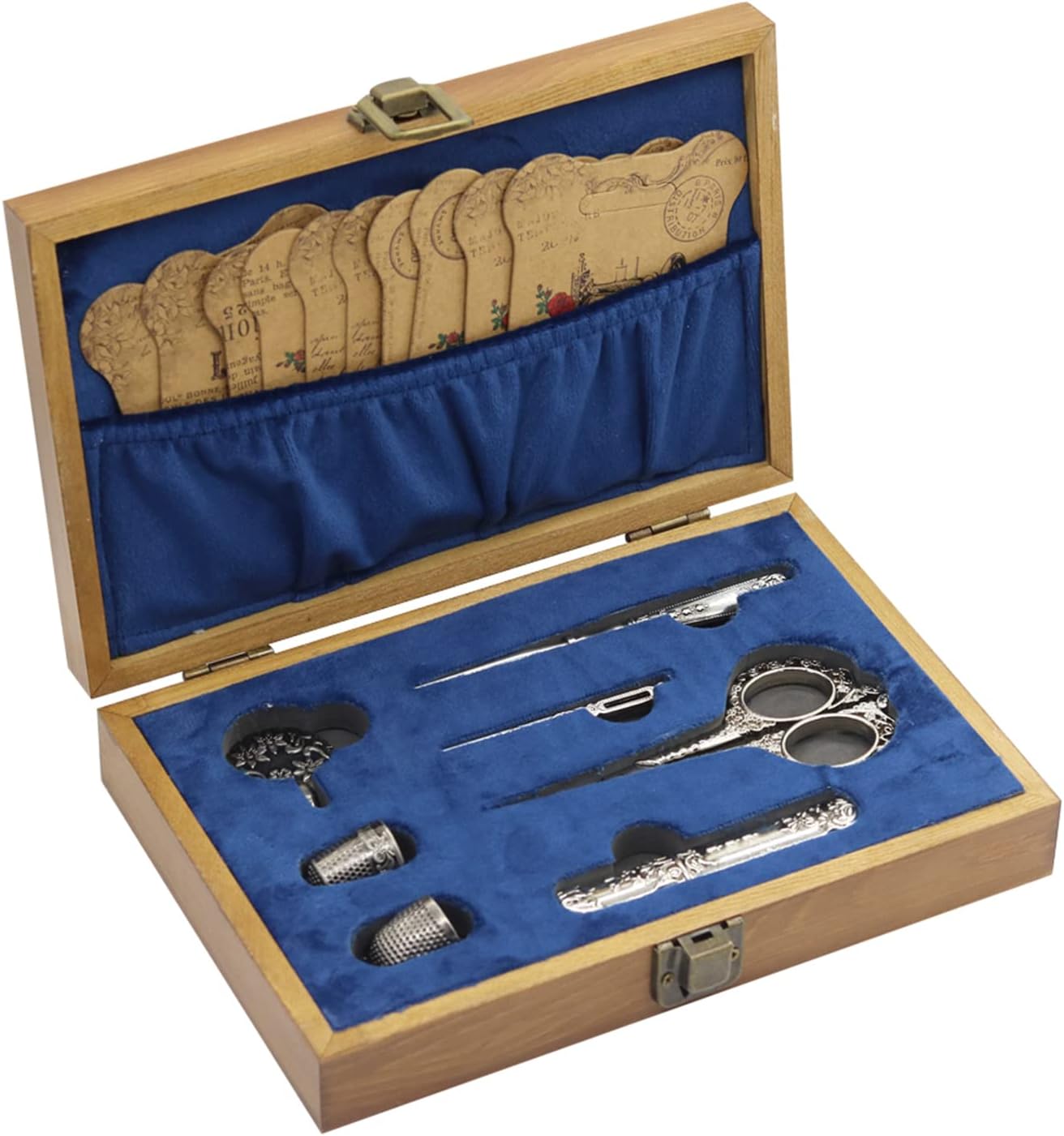- Package included: 1 * awl, 1 * thread cutter, 2 * thimbles, 1 * needle case, 1 * threading needle, 1 * scissor, 10 * winding board, 12 * needles, 1 * wood box